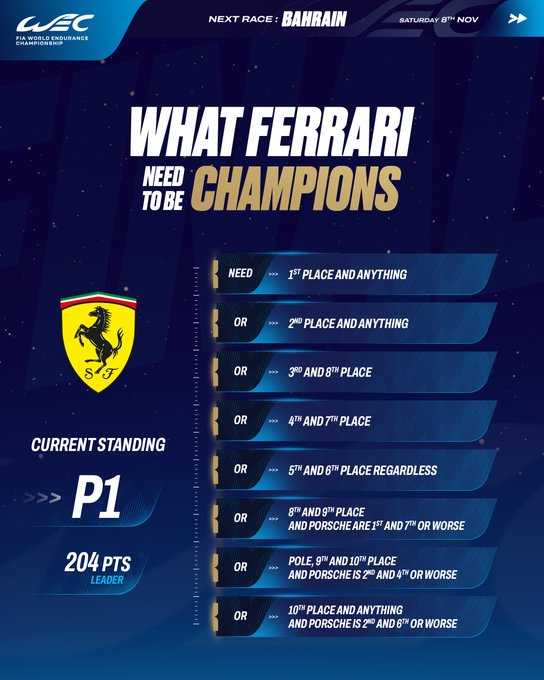 Si vola sul circuito di Sakhir per l’ultimo appuntamento del FIA WEC, la 8 Ore del Bahrain, tappa decisiva per l’assegnazione del titolo piloti e costruttori, con le Ferrari in corsa per entrambe le corone. Appuntamento da non perdere sabato a partire dalle 12 su Sky Sport 257 per seguire integralmente l’ultimo, decisivo, appuntamento dell’anno.