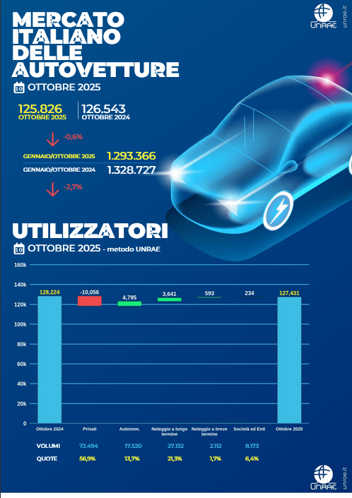 Il mercato italiano delle autovetture chiude il mese di ottobre con 125.826 immatricolazioni, registrando un lieve calo (-0,6%) rispetto alle 126.543 unità dello stesso mese del 2024. Il bilancio dei primi dieci mesi dell’anno evidenzia una contrazione del 2,7%, con 1.293.366 immatricolazioni contro le 1.328.727 di gennaio-ottobre 2024. Particolarmente significativo rimane il divario rispetto al 2019, con una perdita di 332.000 unità, pari a -20,4%.