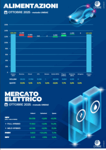 Tra le alimentazioni, a ottobre il motore a benzina cede in volume e perde 4,6 punti, scendendo al 22,9% (25,1% nel cumulato, -4,1 p.p.). Il diesel scende di 3,8 punti al 9,3% di share (al 9,6% in gennaio-ottobre, -4,4 p.p.); il Gpl, in crescita in volume, sale al 9,7% a ottobre (+0,5 p.p.), al 9,3% nel cumulato (-0,1 p.p.). Le vetture ibride nel mese raggiungono il 45,5% (+2,7 p.p.) e il 44,7% (+4,8 p.p.) nei 10 mesi, con un 14,0% per le “full” hybrid e 31,5% per le “mild” hybrid in ottobre. Come anticipato, le auto BEV si portano al 5,0% del totale (+1 p.p. e al 5,2% in gennaio-ottobre, +1,2 p.p.), mentre le PHEV salgono al 7,7% (+4,3 p.p. e al 6,1% nei 10 mesi, +2,8 p.p.).