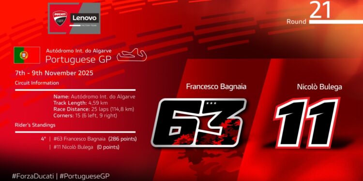 Il Ducati Lenovo Team è in partenza per l’Autódromo Internacional do Algarve che ospita la 21° gara della stagione. In Portogallo si corre stabilmente dal 2020 e sono due i successi firmati Ducati: nel 2023 primo sigillo per Pecco Bagnaia e nel 2024 vittoria di Jorge Martin. Sarà una settimana di prime volte con Nicolò Bulega, vice-Campione del Mondo World SBK con Aruba.it Racing-Ducati, che sostituirà Marc Márquez per gli ultimi due GP del 2025 e debutterà proprio a Portimao nella Premier Class. Nicolò, che ha provato per la prima volta la Desmosedici GP lo scorso giovedì in un test a Jerez de la Frontera, coronerà questo importante traguardo la 100esima gara della sua carriera nel Campionato del Mondo di Motociclismo.