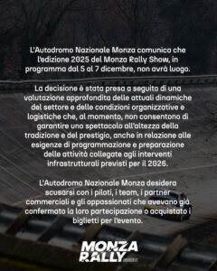 L’Autodromo Nazionale Monza comunica che l’edizione 2025 del Monza Rally Show, in programma dal 5 al 7 dicembre, non avrà luogo. La decisione è stata presa a seguito di una valutazione approfondita delle attuali dinamiche del settore e delle condizioni organizzative e logistiche che, al momento, non consentono di garantire uno spettacolo all’altezza della tradizione e del prestigio, anche in relazione alle esigenze di programmazione e preparazione delle attività collegate agli interventi infrastrutturali previsti per il 2026.