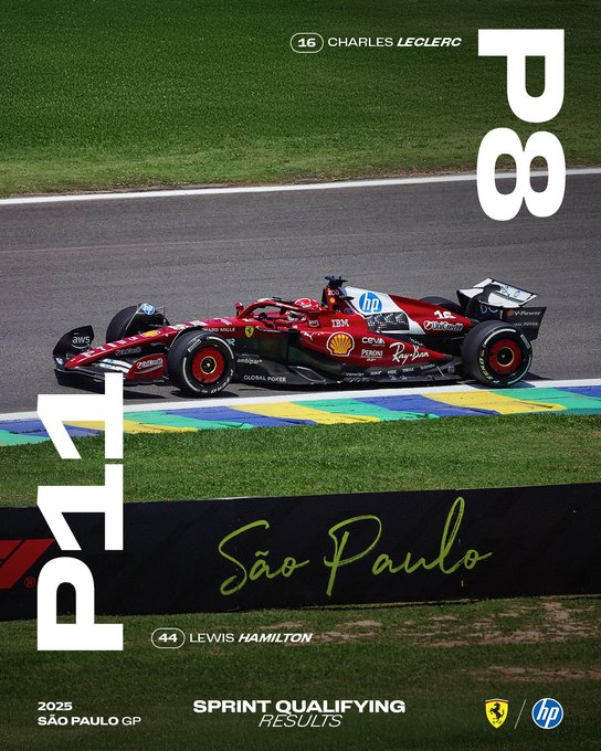 Nella gara Sprint in Brasile Charles Leclerc scatterà dalla quarta fila dopo aver chiuso le qualifiche con l’ottavo tempo, mentre Lewis Hamilton non ha passato il taglio del Q2 e partirà quindi 11° e dalla sesta fila. Dopo essere stato investigato per non aver rallentato con le bandiere gialle dopo il testacoda del compagno di squadra, nessuna penalità per Hamilton, che ha avuto dai commissari FIA solo una reprienda (la prima della stagione). Domani dopo la Sprint Race da 24 giri in programma alle ore 11 locali (15 CET), le squadre potranno lavorare sulle vetture in preparazione delle qualifiche del Gran Premio, che prenderanno il via alle 15 locali (19 CET). QUI gli orari in TV.