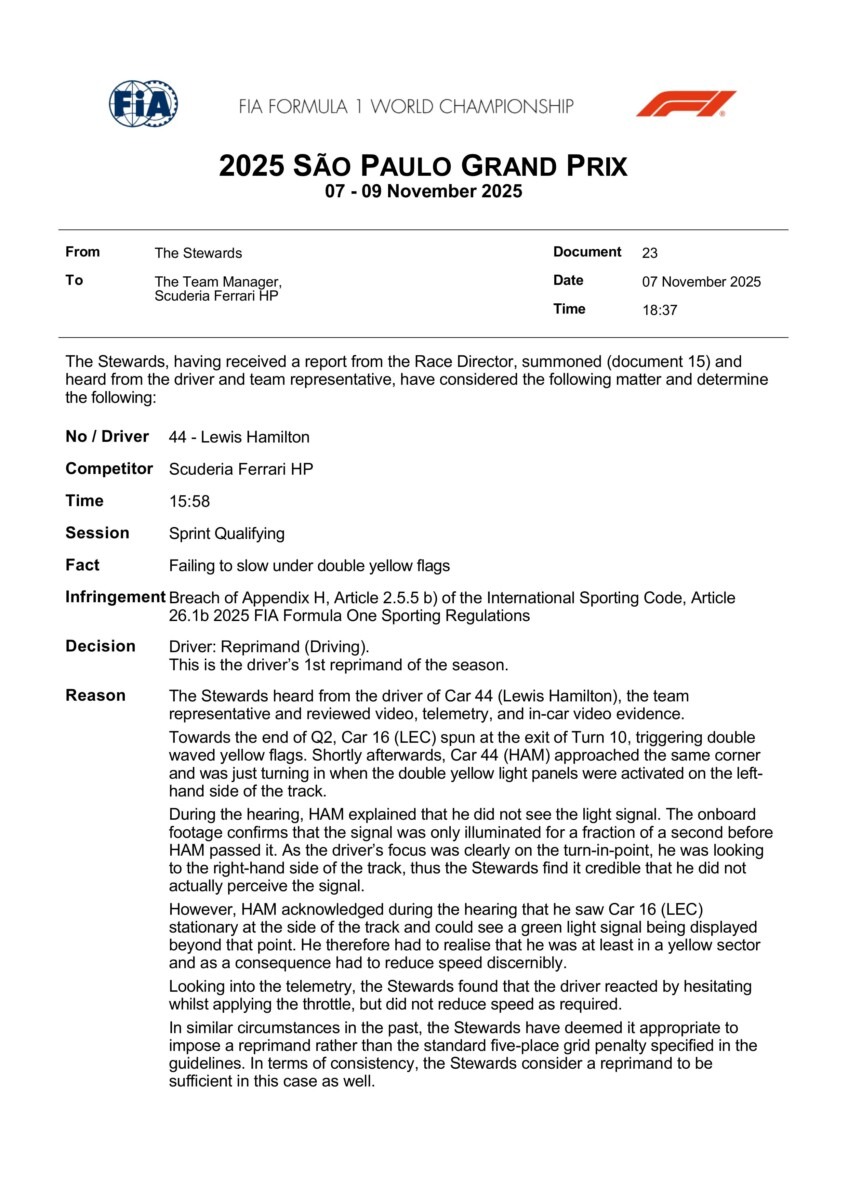 Qualifiche decisamente no per Lewis Hamilton, undicesimo, che sarà anche investigato per una presunta infrazione con bandiere gialle, causate dal testacoda del compagno di squadra [solo una reprimenda per il sette volte campione, ndr]. Fuori in SQ2 anche la Williams di Alex Albon, l’Alpine di Pierre Gasly, la Sauber di Gabriel Bortoleto e la Haas di Ollie Bearman. Solo 16° Franco Colapinto, che non festeggia nel migliore dei modi il rinnovo del contratto con Alpine, davanti alla Racing Bulls di Liam Lawson, alla Red Bull di Yuki Tsunoda (ormai le sue non-prestazioni non fanno più notizia), la Haas di Esteban Ocon e la Williams di Carlos Sainz.