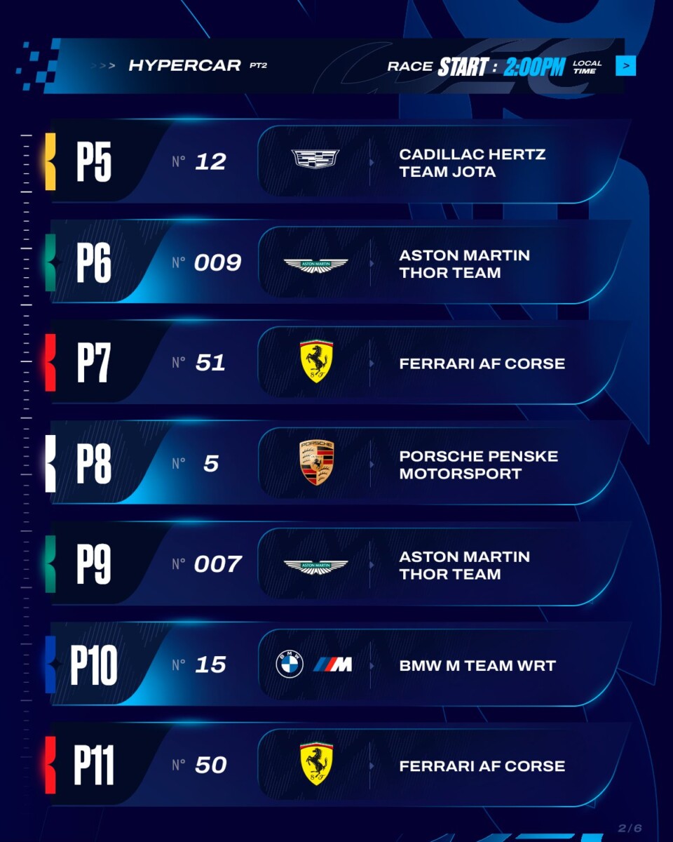 Qualifiche. Nella prima sessione cronometrata, disputata con pista asciutta a temperature di aria e asfalto intorno ai 29° e 34°C rispettivamente, Giovinazzi ha qualificato la vettura numero 51, fermando i cronometri a 1’47”949, un tempo valso l’ottava posizione – con un distacco di +0”659 dai leader – e l’accesso alla Hyperpole. Il turno di Fuoco con la 499P numero 50 è stato maggiormente condizionato dal traffico in pista: per soli 39 millesimi di secondo il pilota italiano – il cui miglior tempo sul giro è stato di 1’48”176 – non è riuscito a rientrare in top-10. Fuoco ha ottenuto un posto in sesta fila in griglia di partenza come Robert Kubica, 12esimo con la 499P numero 83: il miglior tempo del polacco è stato di 1’48”186.