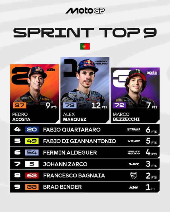 Francesco Bagnaia – 8º: “La Sprint non è andata come speravamo. Nei primi giri ho consumato molto le gomme e nel finale mi hanno passato nell’ultima uscita di curva. È stato un mio errore di valutazione e dobbiamo lavorare in vista della gara. Il set-up di oggi era buono nelle curve veloci, ma mi mancava un po’ di grip al posteriore. Purtroppo, non abbiamo potuto sfruttare le FP2, quindi abbiamo proseguito con questa configurazione. Nel finale il grip era completamente assente: ho provato a gestirlo durante la Sprint ma non ci sono riuscito. Il warm-up di domani sarà molto importante per migliorare e faremo del nostro meglio in gara”.