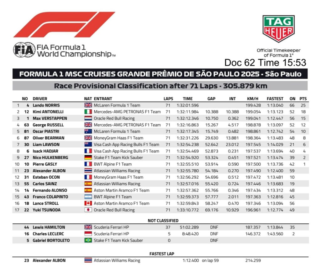 Norris ha tagliato il traguardo con un vantaggio di 10 secondi, conquistando la settima vittoria della stagione e la numero 11 in F1. Alle sue spalle, come detto, la Mercedes di Antonelli, al miglior risultato in carriera, e il quattro volte campione olandese, che ha infiammato il pubblico di Interlagos. Quarta la seconda Mercedes di George Russell, pressato da Piastri negli ultimi giri. E chissà come sarebbe andata la gara dell’australiano senza quell’errore e quella penalità. Ottimo weekend per Ollie Bearman, sesto con la Haas, seguito dalle Racing Bulls di Lawson e Isack Hadjar, dalla Sauber di Nico Hulkenberg e dall’Alpine di Pierre Gasly. Fuori dai punti Alex Albon, la Haas di Esteban Ocon e l’altra Williams di Carlos Sainz, poi l’Aston Martin di Fernando Alonso, l’Alpine di Franco Colapinto e Lance Stroll, 16°. Ultimo pilota classificato Yuki Tsunoda, che ha anche avuto una seconda penalità di 10 secondi dopo non aver eseguito correttamente la prima.