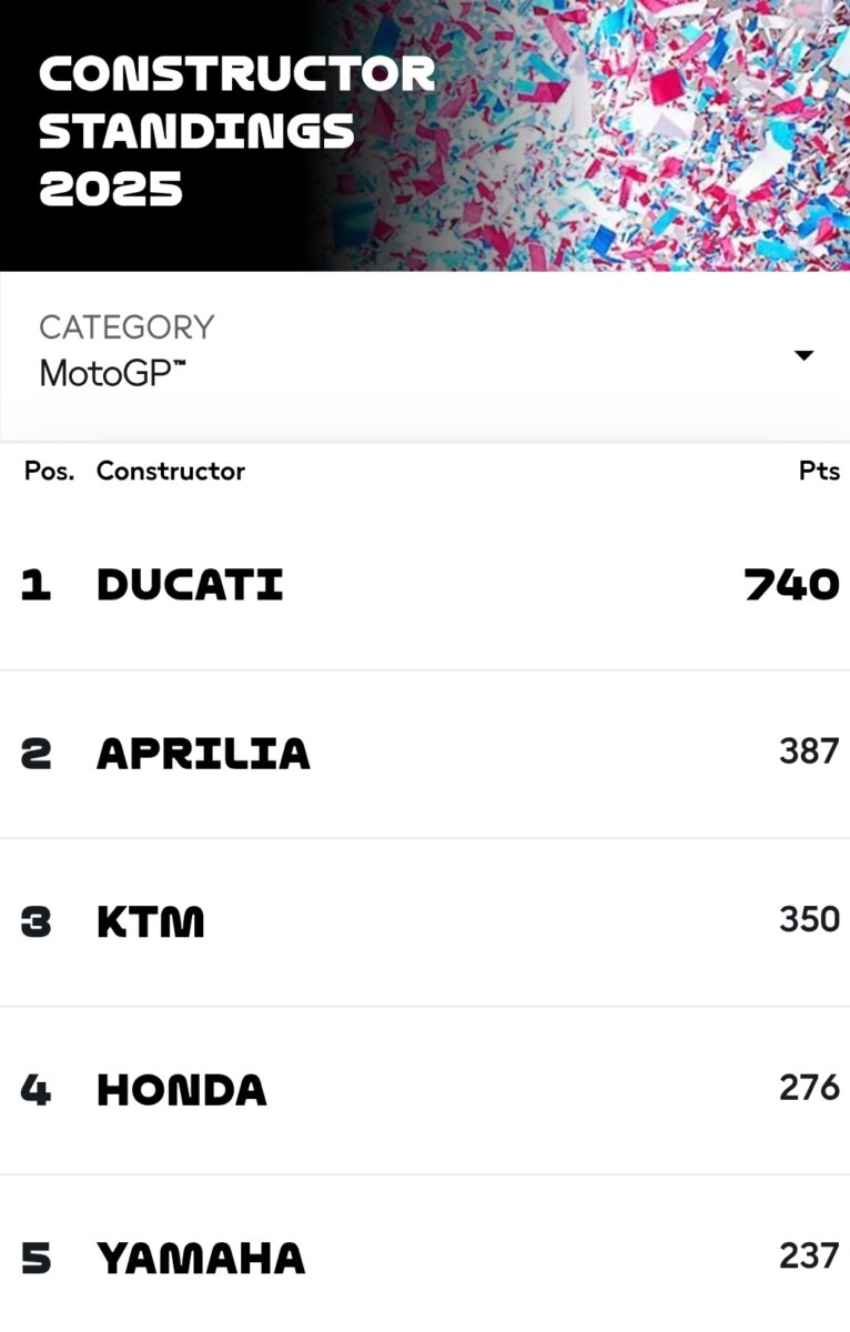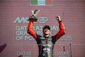 Massimo Rivola, CEO Aprilia Racing: “Marco è stato semplicemente perfetto, dalla partenza fino all’ultimo giro. Già questa mattina nel warm-up, avevamo visto che era particolarmente a posto con la gomma media e sapevamo che poteva giocarsi la vittoria, ma credo che oggi abbia dimostrato una superiorità indiscussa. Quando riusciamo a essere più pronti già dal venerdì, ci giochiamo sempre almeno il podio, e l’avremmo fatto anche a Sepang. Bene Ogura, è stato bello rivederlo guidare come lui sa fare e peccato per Raúl, che non ha preso parte alla gara per una caduta nela FP1. Bene anche tutto ciò che Sava ha provato durante questo weekend. Uno degli obiettivi era conquistare il secondo posto nel Mondiale Costruttori e oggi è garantito. Il prossimo è assicurare il terzo posto per Marco, e dovremo fare di tutto per raggiungerlo. È da un po’ che dico che a Noale stiamo lavorando molto bene e sono veramente contento per tutti quelli che lavorano nella Factory. Speriamo di fare un’ultima gara bella e un ottimo test, perché il 2026 ci deve vedere da subito protagonisti“.