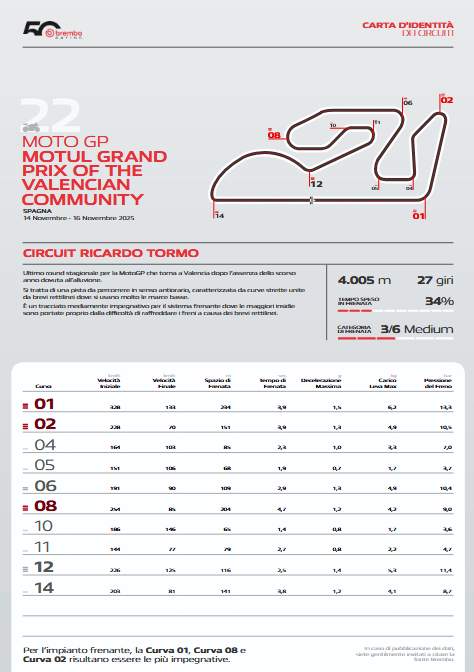 La curva più dura del Circuit Ricardo Tormo per l’impianto frenante è la prima: le moto passano da 328 km/h a 133 km/h in 3,9 secondi in cui percorrono 234 metri. Per riuscirci i piloti esercitano un carico di 6,2 kg sulla leva del freno e subiscono una decelerazione di 1,5 g mentre la pressione del liquido freno raggiunge i 13,3 bar.