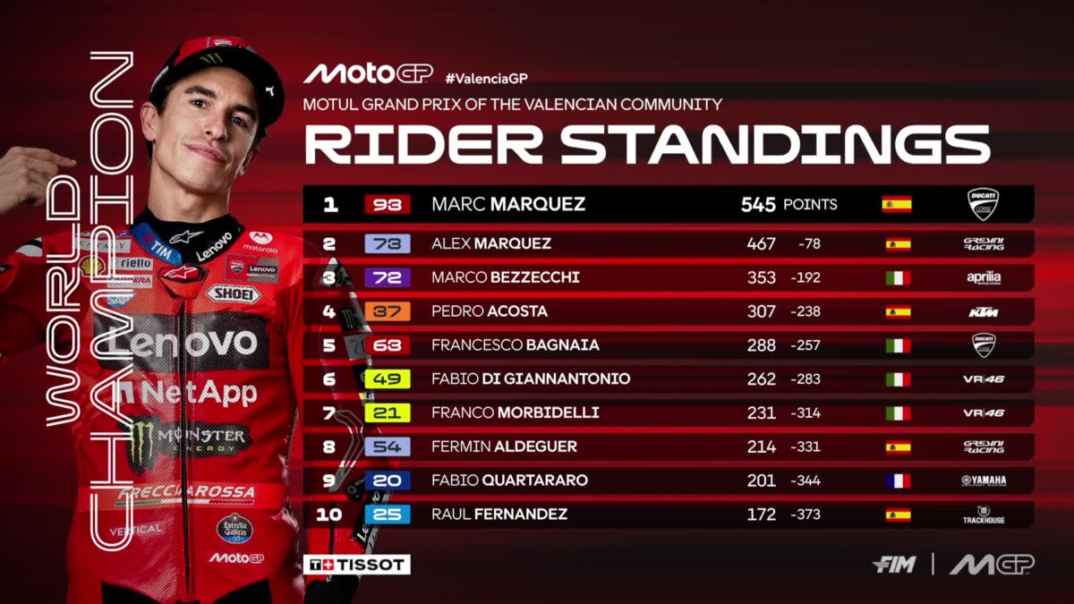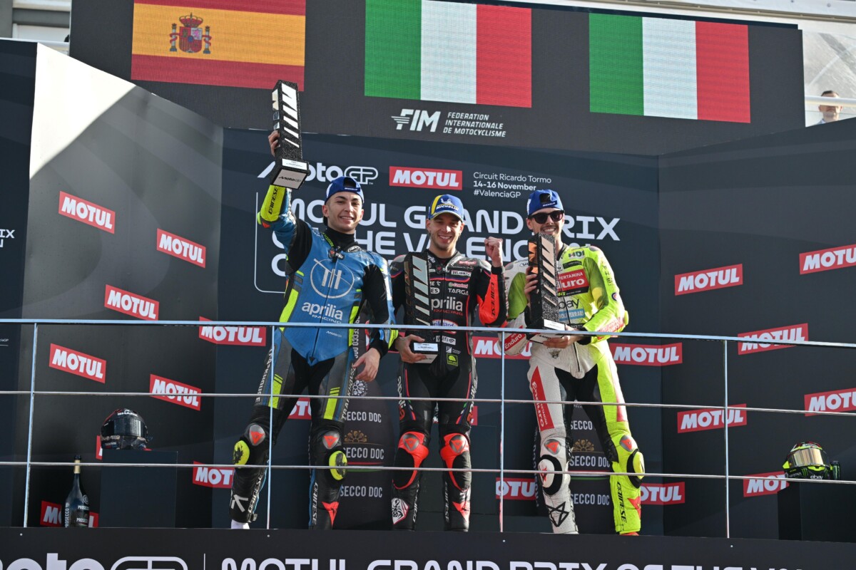 Nelle fasi finali, Di Giannantonio è riuscito a rientrare nella bagarre per il terzo posto, mentre davanti Raul Fernandez riusciva a limare qualche altro decimo su Bezzecchi. Non è mai arrivato abbastanza vicino per attaccare, però, come fatto invece dal numero 49, che ha piegato Acosta al penultimo passaggio e si è messo in tasca il terzo posto. Alex Marquez, quinto, ha ceduto un’altra posizione all’ultima curva della gara, quando è stato superato dal compagno di squadra Fermin Aldeguer (BK8 Gresini Racing MotoGP). Alle loro spalle Luca Marini (Honda HRC Castrol), settimo. A chiudere la top 10 dell’ultimo appuntamento dell’anno Brad Binder (Red Bull KTM Factory Racing), Jack Miller (Prima Pramac Yamaha MotoGP) ed Enea Bastianini (Red Bull KTM Tech3).