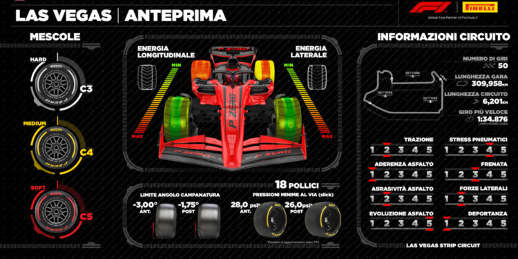 Per il terzo anno consecutivo, le mescole selezionate per il Gran Premio cittadino di Las Vegas sono C3, C4 e C5. Una delle sfide principali sarà la gestione della temperatura degli pneumatici, soprattutto nelle qualifiche. L’anticipazione delle sessioni di pista sarà un aiuto per i piloti che troveranno così condizioni meno rigide che facilitano il riscaldamento delle gomme. Sarà comunque cruciale effettuare un giro di preparazione prima di quello lanciato per portare le mescole nella corretta finestra di utilizzo. I pneumatici di quest’anno presentano inoltre proprietà meccaniche migliorate, che dovrebbero ridurre il degrado, particolarmente evidente lo scorso anno sulla mescola media. La scelta di non optare per un tris ancora più morbido è legata al rischio che il graining, comparso fin dalla prima edizione, possa compromettere eccessivamente l’efficacia dell’attuale mescola più morbida della gamma.