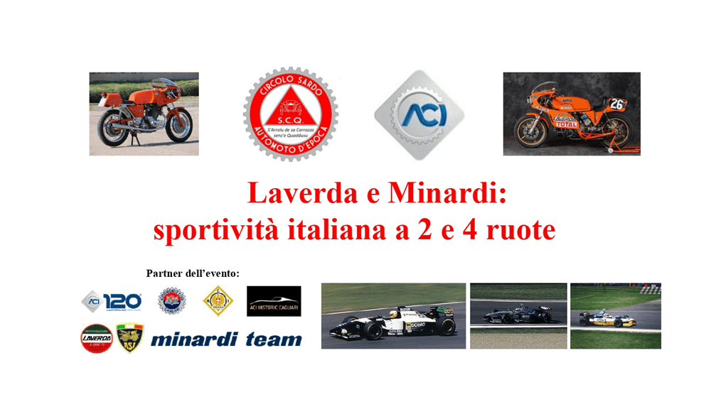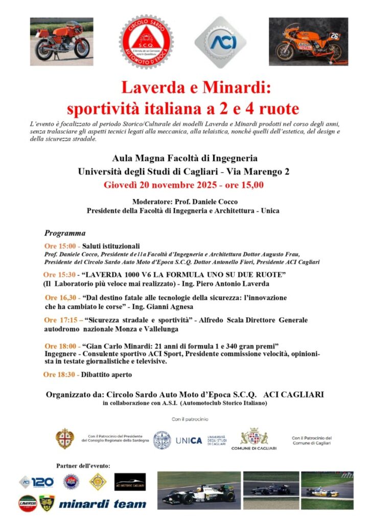 Giovedì 20 novembre, alle 15:00, si terrà un importante convegno presso l’Università degli Studi di Cagliari, nell’Aula Magna della Facoltà di Ingegneria (Via Marengo 2). L’Automobile Club Cagliari e il Circolo Sardo Auto Moto d’Epoca S.C.Q., in collaborazione con A.S.I. (Automotoclub Storico Italiano) organizzano il convegno “Laverda e Minardi: sportività italiana a 2 e 4 ruote”, un’affascinante esplorazione della storia, della tecnica e della passione che hanno reso celebri due simboli del motorsport italiano. Il convegno, aperto a tutti, è rivolto agli appassionati di motori e alla brillante creatività italiana che ha segnato la storia delle corse.