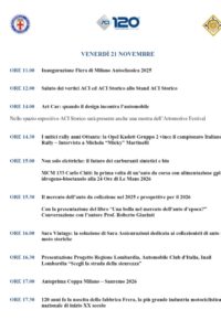ACI, ACI Storico e AC Milano presentano il programma ufficiale delle attività che animeranno lo Stand ACI Storico nel corso di Milano AutoClassica, in programma da venerdì 21 a domenica 23 novembre a Milano Rho Fiera. Dopo il taglio del nastro della manifestazione, previsto venerdì 21 novembre alle ore 11, nello Stand prenderà il via, a partire dalle 12, un palinsesto di tre giorni scanditi da incontri, anteprime, racconti ed approfondimenti dedicati al valore culturale del motorismo storico in tutte le sue declinazioni.