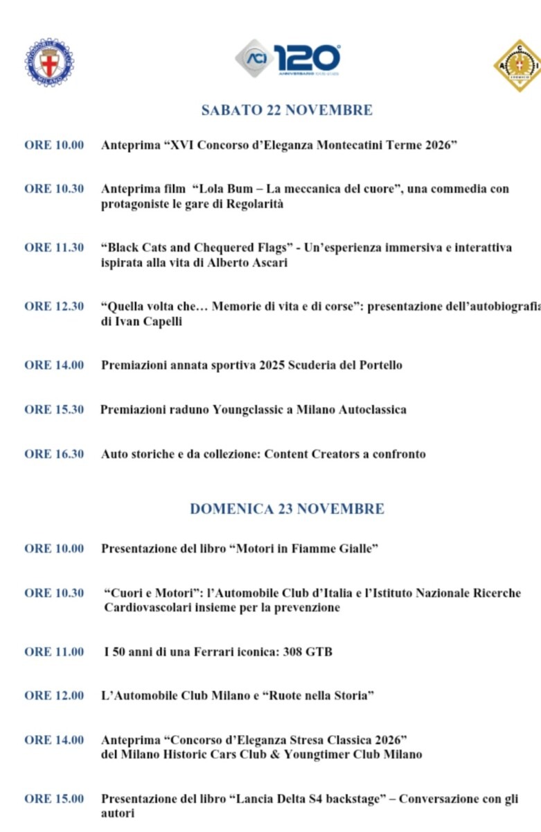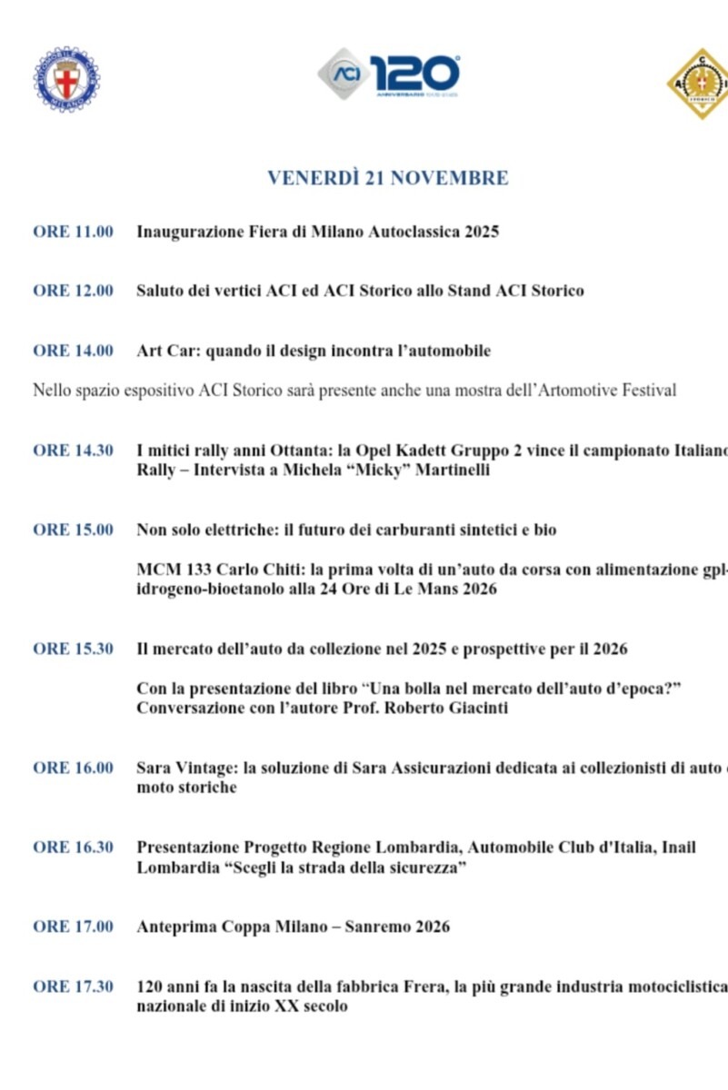 ACI, ACI Storico e AC Milano presentano il programma ufficiale delle attività che animeranno lo Stand ACI Storico nel corso di Milano AutoClassica, in programma da venerdì 21 a domenica 23 novembre a Milano Rho Fiera. Dopo il taglio del nastro della manifestazione, previsto venerdì 21 novembre alle ore 11, nello Stand prenderà il via, a partire dalle 12, un palinsesto di tre giorni scanditi da incontri, anteprime, racconti ed approfondimenti dedicati al valore culturale del motorismo storico in tutte le sue declinazioni.