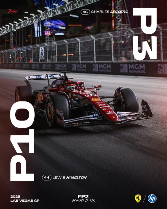 La Scuderia Ferrari nella prima giornata di prove libere ha messo insieme un totale di 98 giri, 43 con Lewis e 45 con Charles che nel finale della seconda sessione ha dovuto parcheggiare a bordo pista la sua SF-25 a causa di un problema al volante. La squadra ha provato due delle tre mescole da asciutto portate a Las Vegas da Pirelli. Domani nell’ultima sessione di prove libere, prevista alle 16.30 (1.30 CET), il focus sarà soprattutto sulla qualifica delle ore 20 (5 CET) ma sarà necessario anche verificare il comportamento delle gomme in configurazione gara, dato che non è stato possibile farlo oggi.