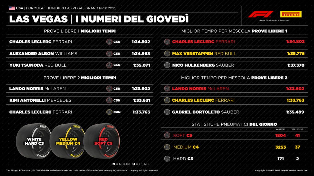 Nella prima ora di prove sotto le luci del Las Vegas Strip circuit, Leclerc è stato il più veloce in 1’34”802, davanti ad Alex Albon su Williams e Yuki Tsunoda (Red Bull Racing). La maggior parte dei piloti ha iniziato con la Medium, mentre Nico Hulkenberg (Sauber) è stato l’unico a utilizzare la Hard. Fernando Alonso (Aston Martin) è stato il primo a provare la mescola più morbida portata da Pirelli a Las Vegas. Tutte le vetture girano con livelli di carico aerodinamico molto bassi, simili a Monza, per adattarsi alla natura ad alta velocità di questo tracciato cittadino.