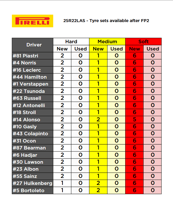 Qualche goccia di pioggia prima dell’inizio delle FP2 non ha avuto effetti significativi sulle condizioni dell’asfalto e l’intero gruppo è sceso in pista con le Medium, ad eccezione di Gabriel Bortoleto (Sauber), che ha utilizzato inizialmente le C3 prima di passare alle C4 come gli altri. Liam Lawson (Racing Bulls) è stato il primo a tentare una simulazione di qualifica con le Soft, seguito dal resto del gruppo a metà sessione. A 20 minuti dalla fine sono state esposte le bandiere rosse per un tombino che si sarebbe allentato prima della curva 17. La sessione è ripresa con sei minuti rimanenti, ma a due minuti dal termine le bandiere rosse sono tornate per lo stesso motivo e la pista non è più stata riaperta. La classifica dei tempi non è dunque una fotografia totalmente affidabile oggi, visto che alcuni piloti non sono riusciti a completare la simulazione di qualifica. L’interruzione ha inoltre reso la sessione difficile da interpretare, perché i piloti non sono riusciti a effettuare long run utili per raccogliere dati in vista della gara. Il fatto che la pista sia sempre molto sporca all’inizio del weekend comporta un’evoluzione molto marcata e i tempi continueranno a scendere rapidamente domani, pioggia permettendo.