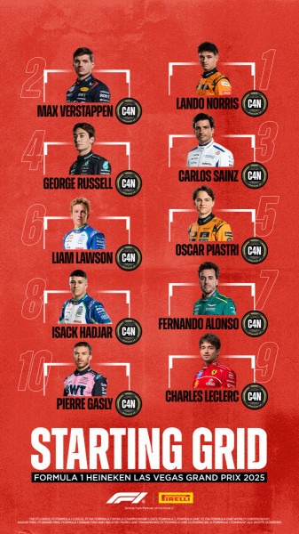 Lando Norris partirà dalla pole nel GP di Las Vegas, dopo essere stato il più veloce in una sessione di qualifiche emozionante disputata interamente sul bagnato. Il suo miglior tempo in Q3 è stato di 1’47”934. Per il pilota McLaren si tratta della sesta pole della stagione, la sedicesima in carriera. Il leader del campionato avrà accanto a sé in griglia uno dei suoi due rivali per il titolo, Max Verstappen, pilota Red Bull, che è stato il secondo più veloce. In terza piazzola Carlos Sainz con la Williams, lo spagnolo si era qualificato secondo per questa gara con la Ferrari lo scorso anno. Il compagno di squadra di Norris, Oscar Piastri, attualmente secondo nella classifica piloti, è riuscito solo a ottenere il quinto tempo, penalizzato dalle bandiere gialle.