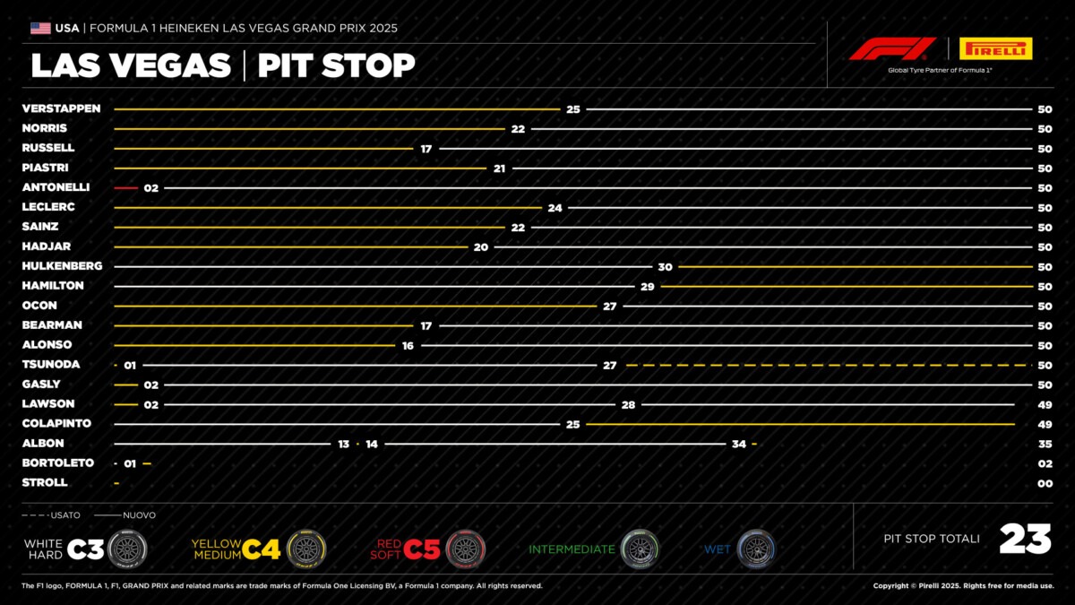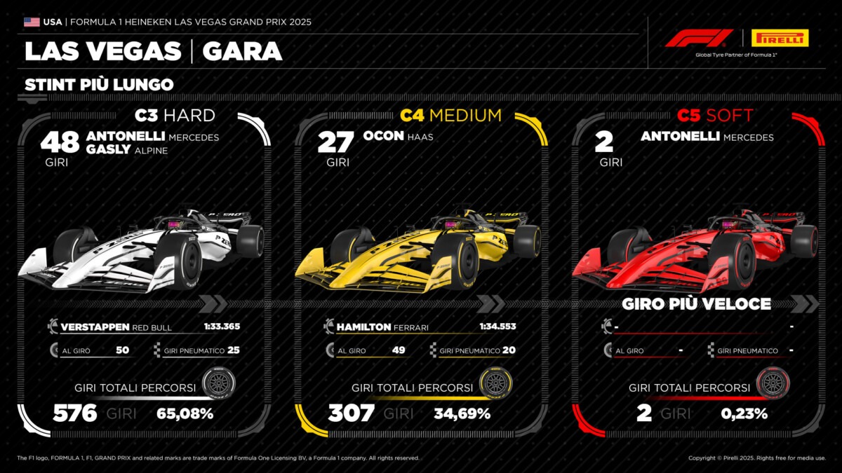 I primi otto hanno tutti concluso la gara con le Hard, mentre Nico Hulkenberg, nono al traguardo, è stato il migliore tra coloro che hanno adottato la strategia inversa. Antonelli ha recuperato ben 13 posizioni tagliando il traguardo quarto, ma una penalità di 5 secondi per partenza anticipata lo ha retrocesso di un posto, al quinto. L’italiano ha completato lo stint più lungo con la gomma Hard, percorrendo tutti i giri tranne due dei 50 totali con la C3, come ha fatto anche Pierre Gasly (Alpine) che ha concluso quindicesimo. Esteban Ocon, undicesimo con la Haas, è stato invece il pilota che ha percorso più giri con la Medium, completandone 27 sulla C4.