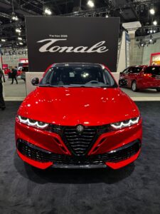 Il design degli esterni di Tonale si presenta ancora più iconico, grazie a proporzioni scolpite e a una carreggiata allargata, mentre sul nuovo frontale spiccano l’inedito scudetto concavo e il trilobo rivisitato, che conferiscono un carattere più deciso. Nuovi anche i cerchi da 19 e 20 pollici interpretano in chiave moderna l’eredità stilistica di Alfa Romeo, trasmettendo forza e dinamismo. Anche l’abitacolo evolve nello stile e nella qualità percepita, con raffinate combinazioni in pelle rossa o Alcantara bicolore nero e bianco. La nuova Alfa Romeo Tonale evolve anche il concetto di personalizzazione grazie alla gamma colori che si arricchisce di tre nuove tinte metallizzate – Rosso Brera, Verde Monza e Giallo Ocra – portando a otto le possibilità di personalizzazione, ulteriormente ampliate dalla scelta del tetto nero a contrasto. L’esemplare esposto al Los Angeles Auto Show è una Tonale Sport Speciale di colore Rosso Brera equipaggiata con un propulsore specifico per il mercato nordamericano: il 2.0 litri Turbo benzina da 268 HP (circa 272 CV) e coppia 295 lb-ft (circa 401 Nm).