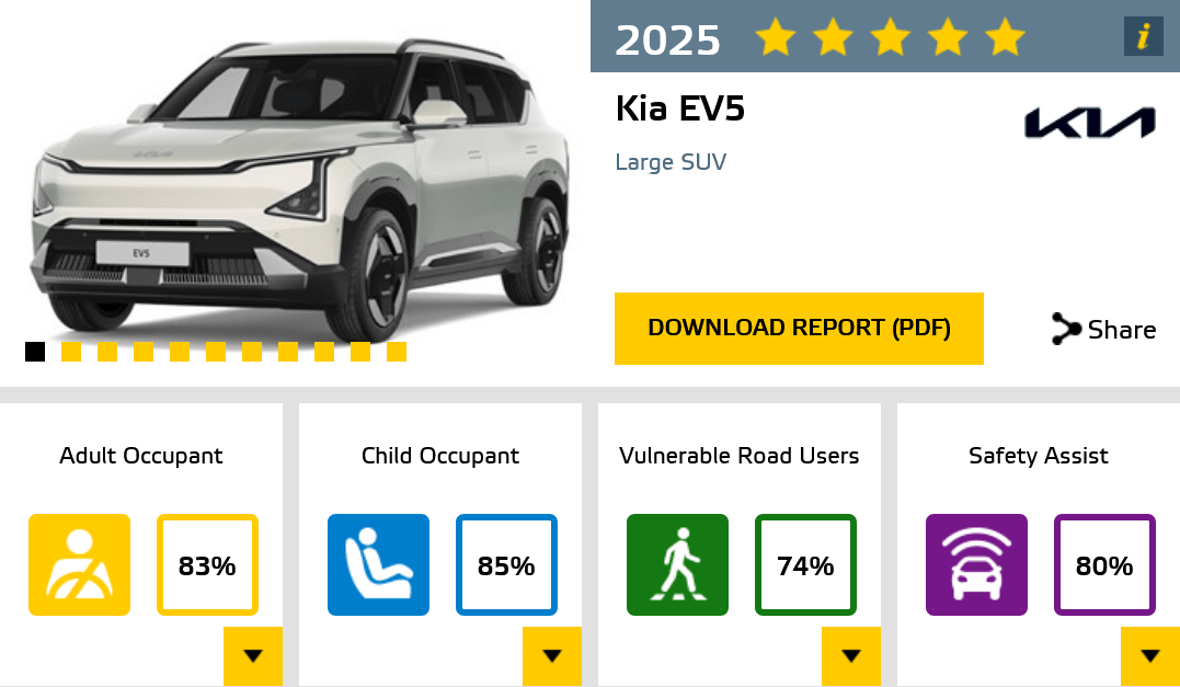 Kia EV5 ottiene 5 stelle EuroNCAP