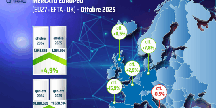 Il mercato europeo delle auto prosegue il suo trend positivo registrando a ottobre una crescita del 4,9% con 1.091.904 immatricolazioni rispetto alle 1.041.389 unità dello stesso mese del 2024. Nel periodo gennaio-ottobre il mercato europeo totalizza 11.020.514 immatricolazioni: un incremento dell’1,9% rispetto alle 10.818.539 dei primi dieci mesi del 2024. Tuttavia, il confronto con il 2019 evidenzia ancora un divario significativo: -10,1% in ottobre e -17,3% nei 10 mesi. Analizzando l’andamento dei principali mercati, emerge una situazione differenziata tra i 5 Major Market.