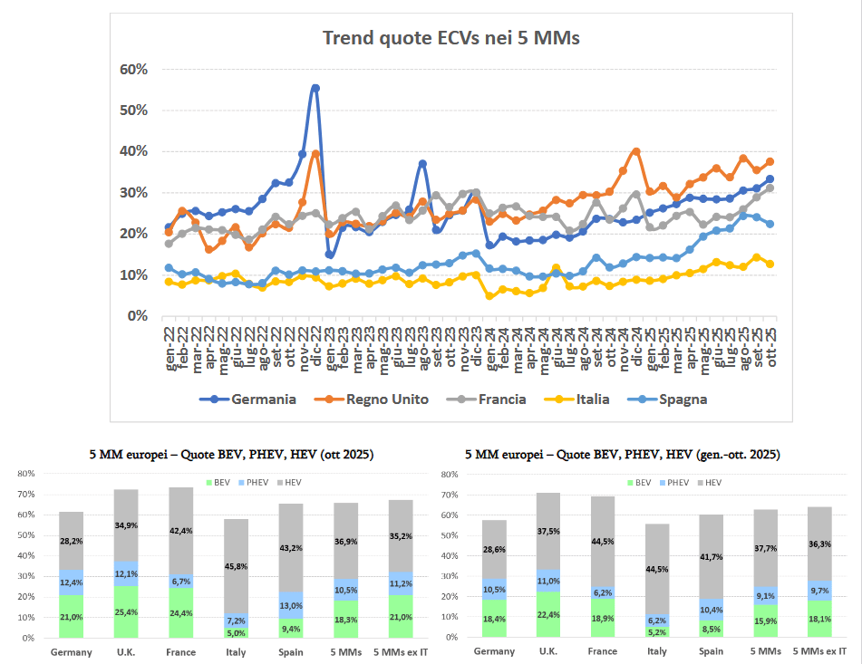 Anche nel periodo gennaio-ottobre la situazione italiana si conferma critica con una quota di ECV all’11,2%, di cui il 5,2% di BEV e il 6,0% di PHEV, rispetto al 33,4% del Regno Unito (BEV 22,4% e PHEV 11,0%), al 28,9% della Germania (BEV 18,4% e PHEV 10,5%), al 25,1% della Francia (BEV 18,9% e PHEV 6,2%) e al 18,9% della Spagna (BEV 8,5% e PHEV 10,4%). Nel totale del mercato europeo le ECV coprono il 27,7% di share con le BEV al 18,3% (+3,5 p.p.) e le PHEV al 9,4% (+2,2 p.p.).