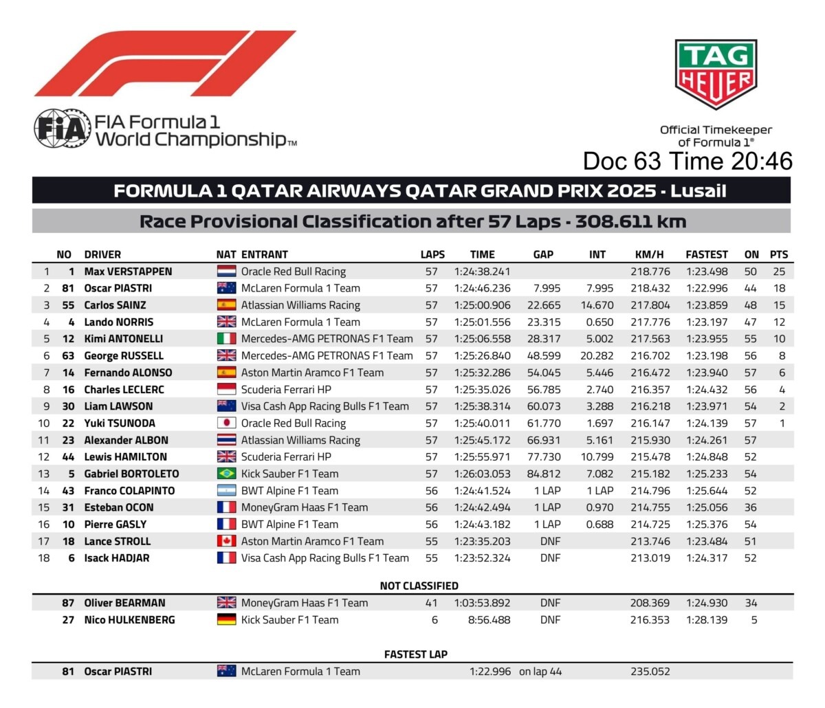 Ottima prestazione per Carlos Sainz, al secondo podio della stagione con la Williams, che ha passato Antonelli nella prima serie di pitstop, con l’italiano che, grazie al quinto posto finale, assicura il secondo posto nel Costruttori alla Mercedes (459 punti contro i 426 della Red Bull). Sesto George Russell (che al via ha perso tre posizioni), grazie alla foratura di Isack Hadjar a tre giri dalla fine, con la top 10 completata da Fernando Alonso, Charles Leclerc, Liam Lawson e Yuki Tsunoda. A chiudere la classifica Alex Albon, Lewis Hamilton, Gabriel Bortoleto e Franco Colapinto. Esteban Ocon ha chiuso 15° dopo una penalità di 5 secondi per falsa partenza, davanti a Gasly, Lance Stroll e Hadjar. Ritiro per Ollie Bearman, dopo aver scontato uno stop/go di 10 secondi per unsafe condition, e per Hulkenberg.
