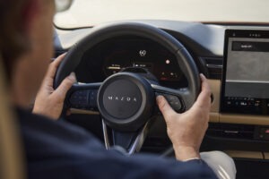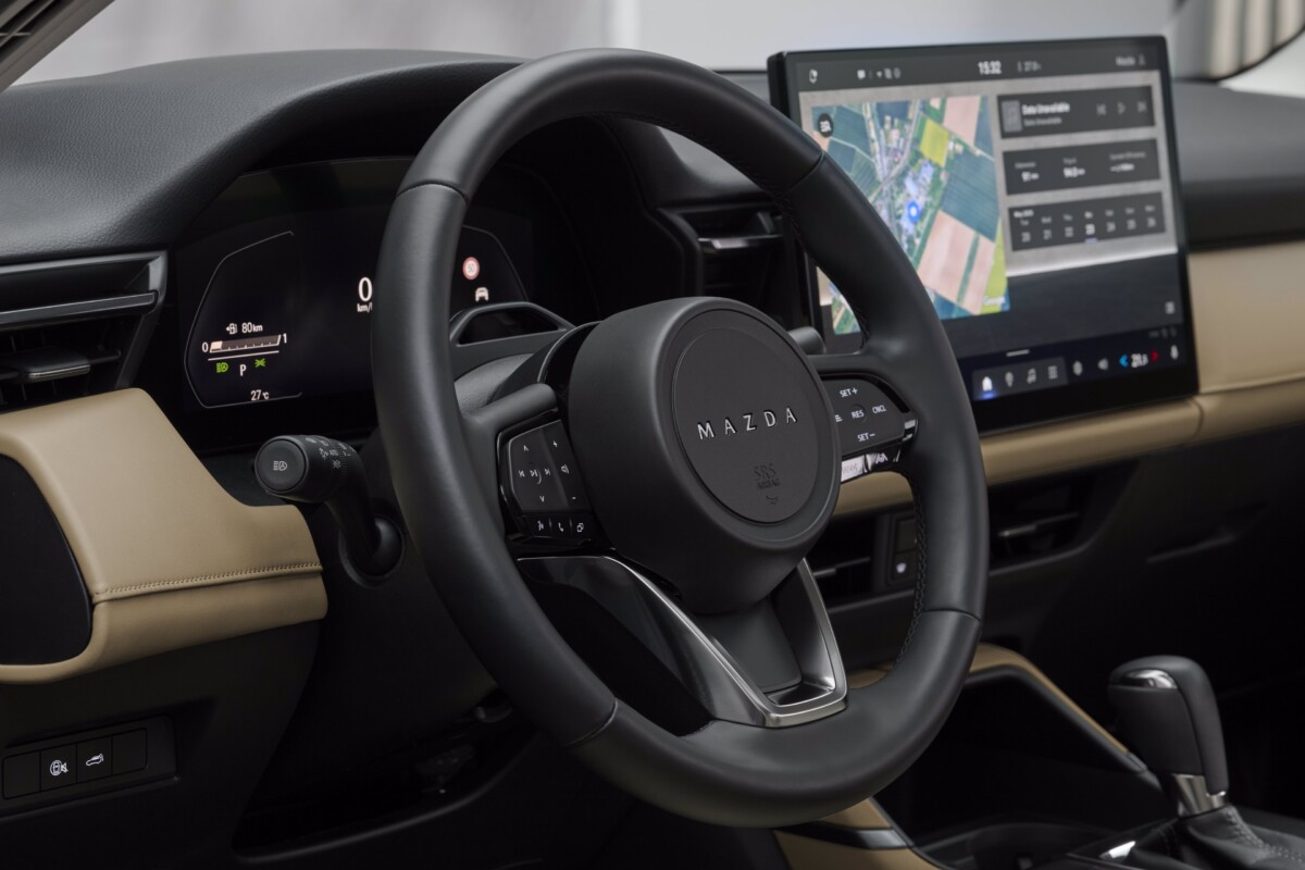La nuova esperienza HMI è progettata per mantenere il guidatore sempre al pieno controllo, riducendo al minimo distrazioni visive, manuali e cognitive. Riflette la filosofia di sicurezza di Mazda, puntando a semplicità e facilità d’uso in ogni interazione. Al centro di un layout orizzontale ben definito si trova un nuovo display touch integrato – disponibile nelle versioni da 12,9 o 15,6 pollici, con un’interazione personalizzabile in stile smartphone. I comandi principali seguono una logica orientata alla sicurezza: i pulsanti fisici restano dedicati alle funzioni essenziali, mentre le funzionalità più utilizzate sono posizionate in alto e sempre visibili, riducendo i movimenti oculari. Tutti i modelli sono dotati di un quadro strumenti digitale da 10,25 pollici e di un head-up display più ampio rispetto al passato. I comandi capacitivi sul volante consolidano funzioni chiave come la visuale a 360 gradi e il Mi-Drive, pur consentendo ancora l’uso tradizionale dei pulsanti a bilanciere. Il riconoscimento vocale ad alta precisione permette inoltre un controllo completo senza togliere le mani dal volante.