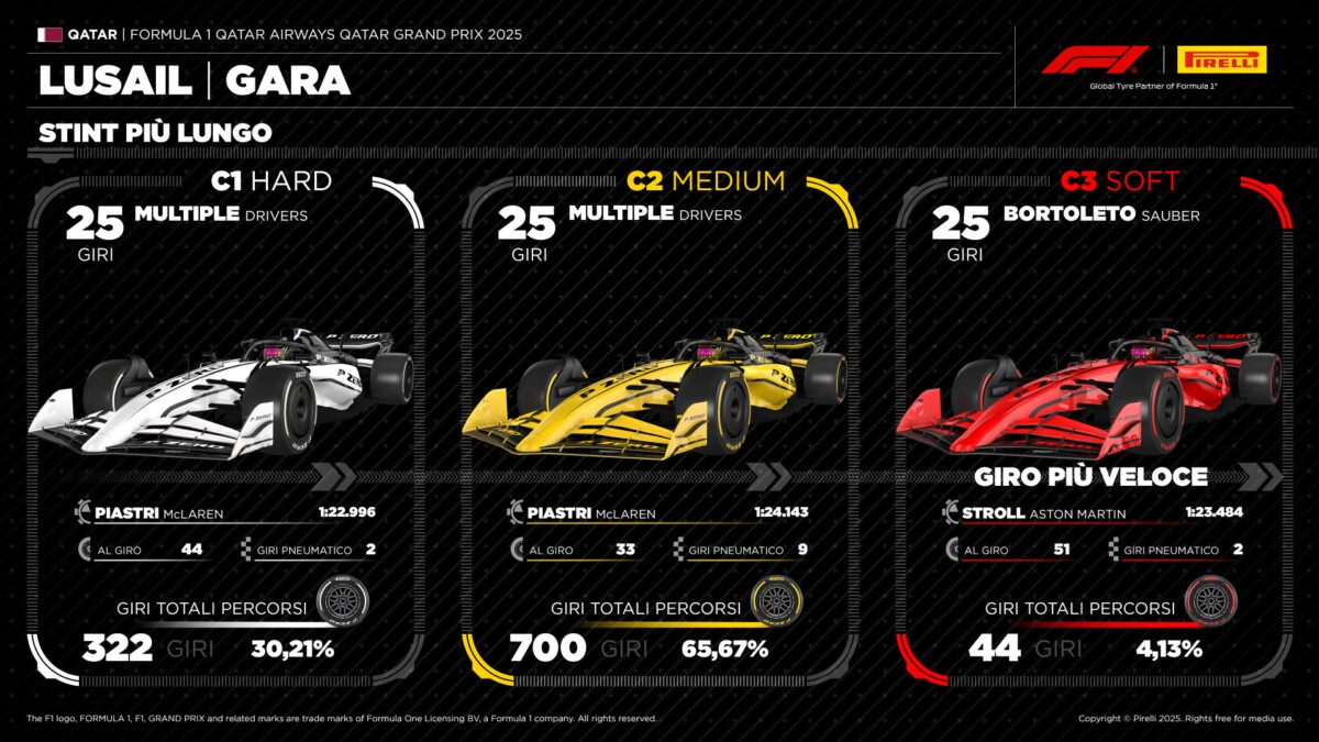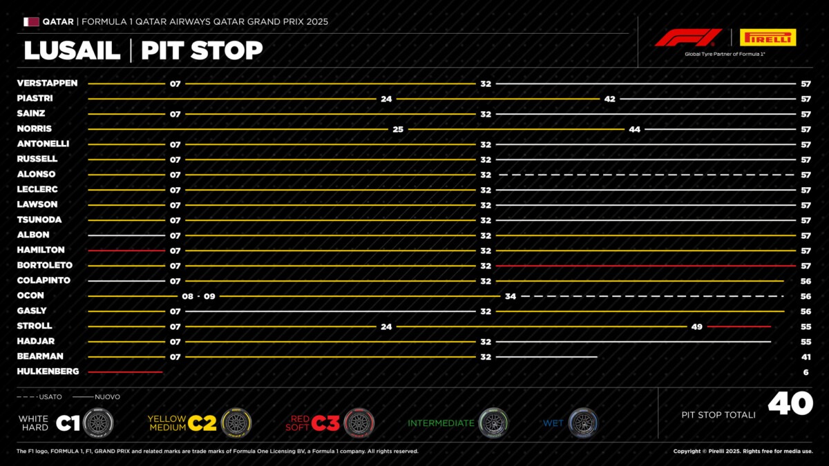 A rendere la gara ancora più complessa dal punto di vista tattico è stato il limite di 25 giri imposto su ogni set di gomme per il GP del Qatar, lungo 57 giri. Le McLaren si sono così ritrovate fuori sincrono con il resto della griglia in termini strategici. Gli altri piloti hanno infatti dovuto fermarsi entro il 32° giro per l’ultimo pit stop, mentre il team papaya ha potuto rimanere più a lungo in pista durante gli stint proprio per la precedente decisione di non fermarsi in regime di neutralizzazione. Oscar Piastri ha ceduto la testa al giro 42 per la sua ultima sosta, seguito due tornate dopo dal compagno Lando Norris, mentre Verstappen, di contro, consolidava il comando.