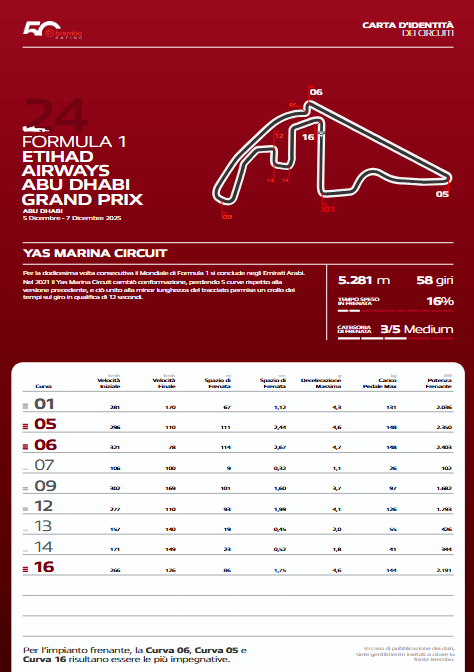Secondo gli ingegneri del Gruppo Brembo, che lavorano a stretto contatto con tutti i team di Formula 1, lo Yas Marina Circuit, lungo 5.281 metri, rientra nella categoria dei tracciati mediamente impegnativi per l’impianto frenante. Su una scala da 1 a 5, si è meritato un indice di difficoltà pari a 3, pur contando 9 frenate al giro, 4 delle quali classificate come Hard e 2 come Medium. Tuttavia, solo in 2 curve i freni vengono utilizzati per almeno 2 secondi e, di conseguenza, nell’arco di un giro intero restano operativi per meno di 13 secondi.