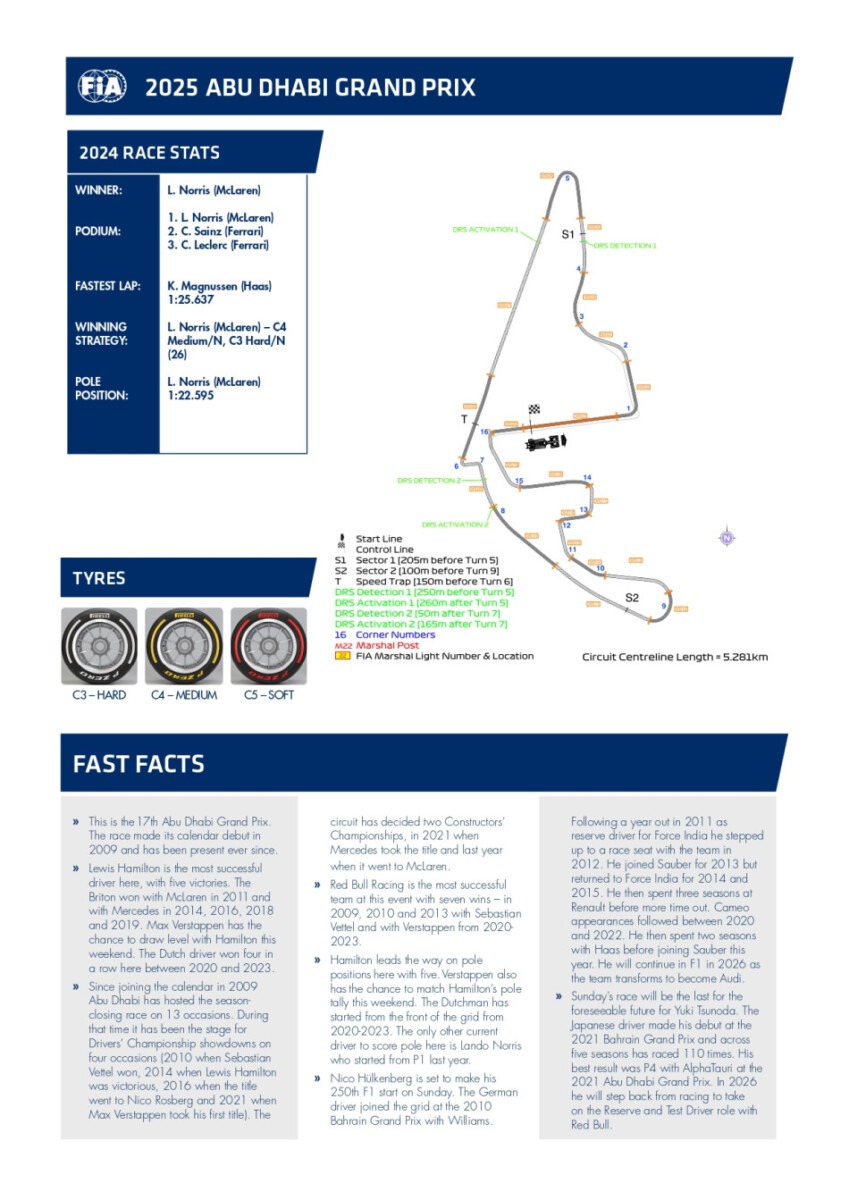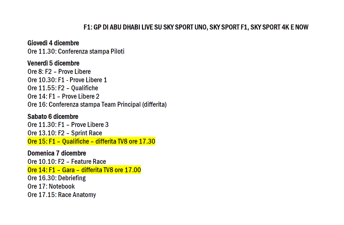 Sembrava una stagione lunghissima e sta già per finire. Il GP di Abu Dhabi sarà infatti l’ultimo atto di un campionato 2025 avvincente e decreterà chi tra Lando Norris, Max Verstappen e Oscar Piastri conquisterà il Titolo Piloti. Si parte giovedì con la conferenza stampa piloti dalle 11.30. Venerdì in pista per la prima sessione di prove libere alle 10.30, mentre la seconda è in programma alle 14.00. Sabato alle 11.30 la terza sessione di libere, con le qualifiche e la lotta per la pole alle 15.00. Domenica alle 14.00 la gara che chiude la stagione. Nel weekend in pista anche l’ultima gara del campionato F2, in cui Leonardo Fornaroli si è laureato campione lo scorso fine settimana in Qatar, ma resta da assegnare quello Team.