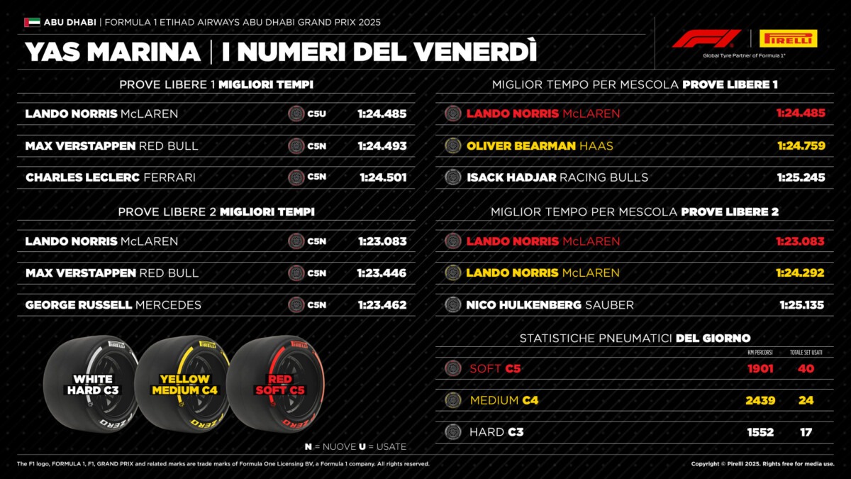 Lando Norris è stato il più veloce nelle prove libere che anticipano la gara decisiva per il titolo piloti della stagione. Il pilota McLaren è rimasto in cima alla classifica tempi in entrambe le sessioni di oggi, svolte in orari differenti con le FP2 più rappresentative delle qualifiche e della gara, con gomma Soft.