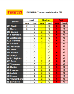 Le FP1, partite alle 13:30 ora locale, si sono svolte in condizioni ancora più calde. Norris ha ottenuto la prima posizione con la Soft, seguito da Verstappen. Piastri ha invece saltato la sessione, sostituito da Pato O’Ward, uno dei nove rookie che sono scesi in pista oggi (piloti che non hanno disputato più di due Gran Premi). Ogni pilota titolare deve infatti cedere il volante a un esordiente in due sessioni di prove libere nel corso della stagione. Nelle FP1 sono state usate tutte e tre le mescole.