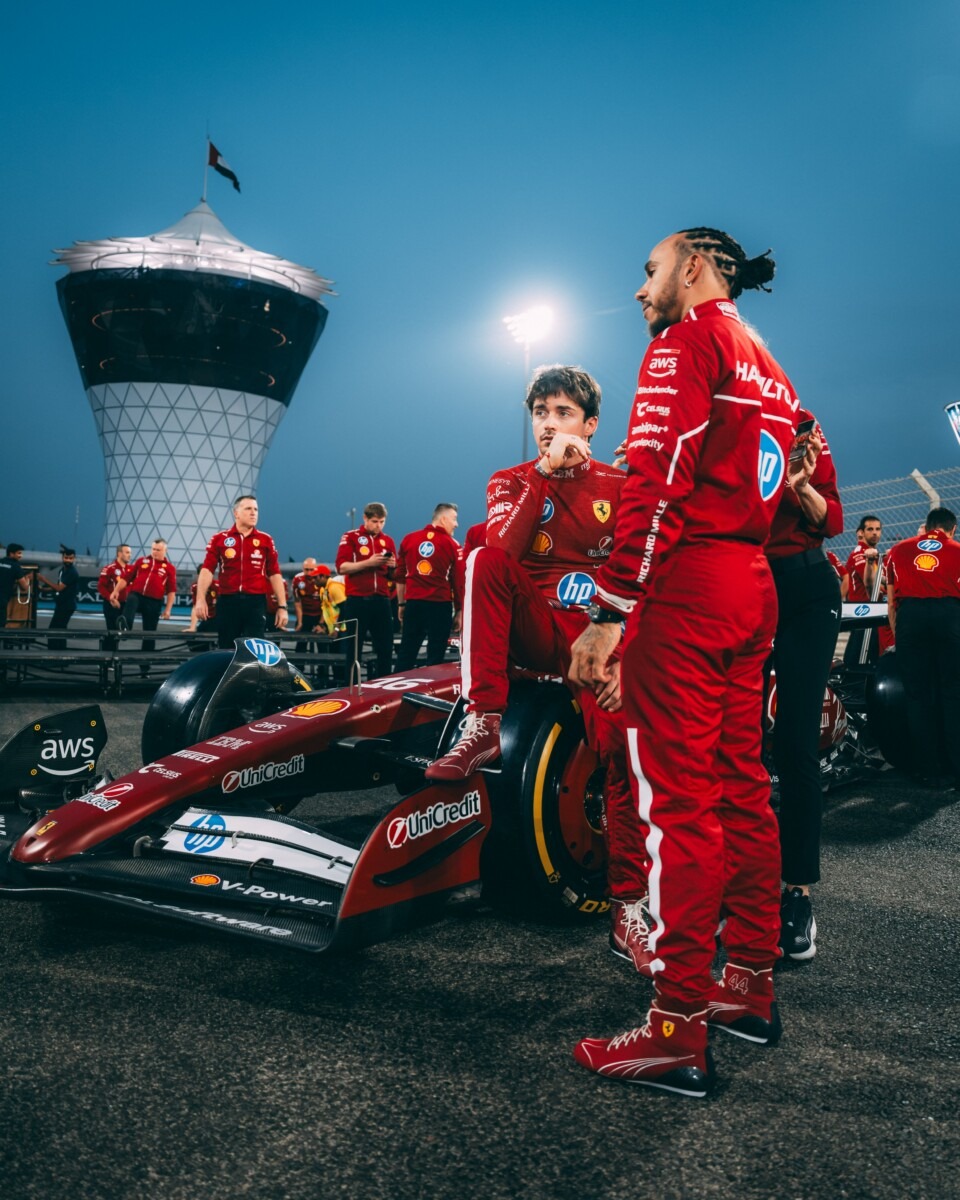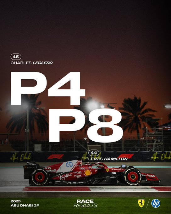 Nel GP di Abu Dhabi, che ha chiuso la stagione 2025, quarto e ottavo posto per Charles Leclerc e Lewis Hamilton. Per i due piloti della Ferrari strategie differenziate: Charles, partito quinto con gomme Medium, e Lewis, che si era qualificato 16° e doveva recuperare posizioni nei primi giri, con le Soft. Leclerc ha avuto un buon avvio, guadagnando una posizione e salendo al quarto posto, mentre Hamilton era già tredicesimo al giro 3. Dopo aver lottato con Fernando Alonso, Charles si è avvicinato a Lando Norris e ha provato ad attaccarlo. Al giro 8 Lewis è rientrato ai box per montare le Hard, e Charles ha effettuato la sua sosta al giro 16, per prevenire un undercut da parte di George Russell. Seconda sosta per Lewis al giro 31, quando i suoi tempi sul giro stavano aumentando. Ha montato le Medium e ha superato diverse vetture. Leclerc ha effettuato la sua seconda sosta otto giri più tardi, sempre per montare le Medium.