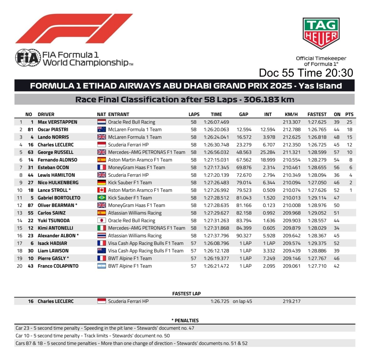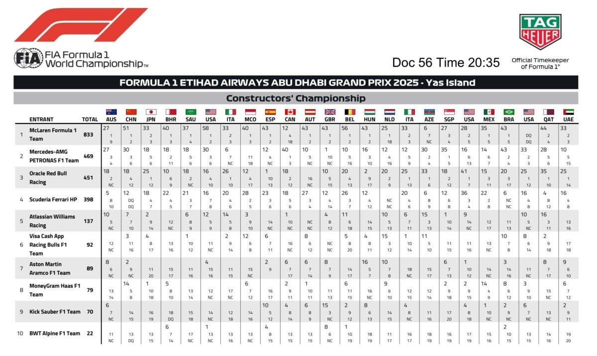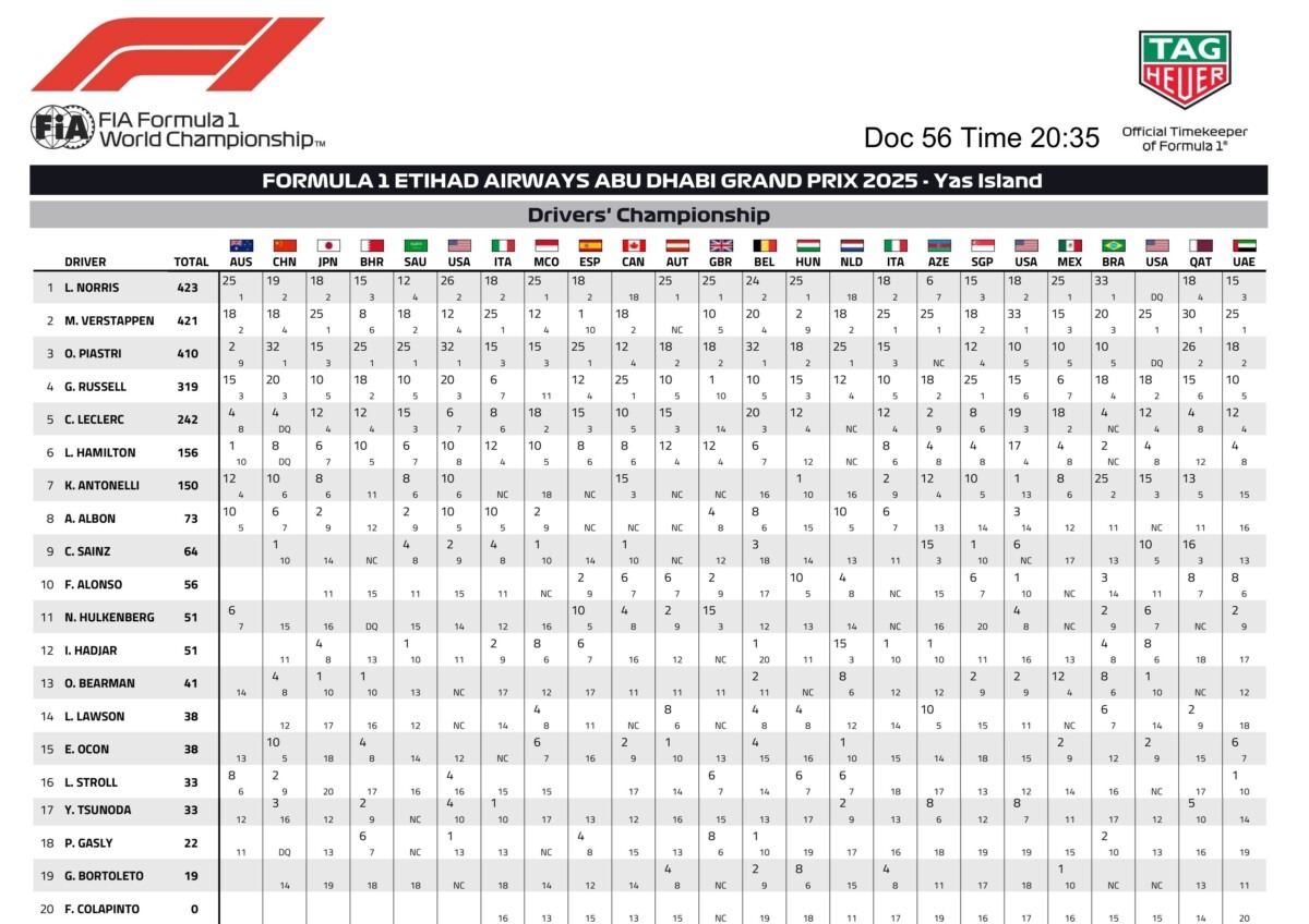 Charles Leclerc: “Ho dato tutto quello che avevo e la squadra ha eseguito la gara alla perfezione. Purtroppo il quarto posto era il massimo a cui potessimo ambire oggi. Volevo davvero chiudere la stagione con una nota positiva, portando a casa un podio per tutti, e in alcuni momenti della gara sono anche stato vicino a Norris, ma non è stato sufficiente per tentare il sorpasso. Congratulazioni a Lando per il suo primo titolo. Ha fatto un lavoro incredibile quest’anno ed è pienamente meritato. Un enorme grazie a tutta la nostra squadra, sia in pista sia a casa, in Italia, per il duro lavoro svolto quest’anno, così come ai nostri Tifosi per il loro supporto continuo. È stata una stagione difficile per noi. La prossima è ancora una pagina bianca e non sappiamo a che livello siano le altre squadre, quindi non abbiamo ancora vere aspettative. Dopo questa settimana torneremo a Maranello per riorganizzarci e il nostro compito sarà concentrare tutti i nostri sforzi sulla preparazione della stagione per dare il nostro meglio”.