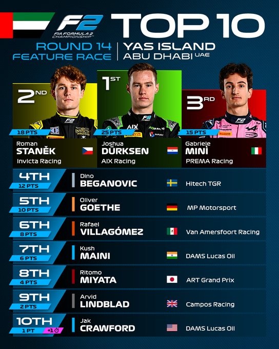 Al netto del risultato, l’ottimo ruolino tenuto nel corso della stagione ha consentito a Fornaroli di contribuire alla vittoria del titolo a squadre del FIA Formula 2 Championship per il team Invicta Racing. A tenere alto il vessillo tricolore a Yas Marina è stato Gabriele Minì. L’ottima strategia del Team Prema, e la perfetta visione di gara del siciliano hanno consentito all’alfiere di ACI Team Italia di trovarsi in top 5 negli ultimi giri. Minì ha poi sferrato gli attacchi decisivi che l’hanno condotto fino al terzo gradino del podio. Per il ventenne di Marineo un ottimo modo per concludere una stagione complicata.