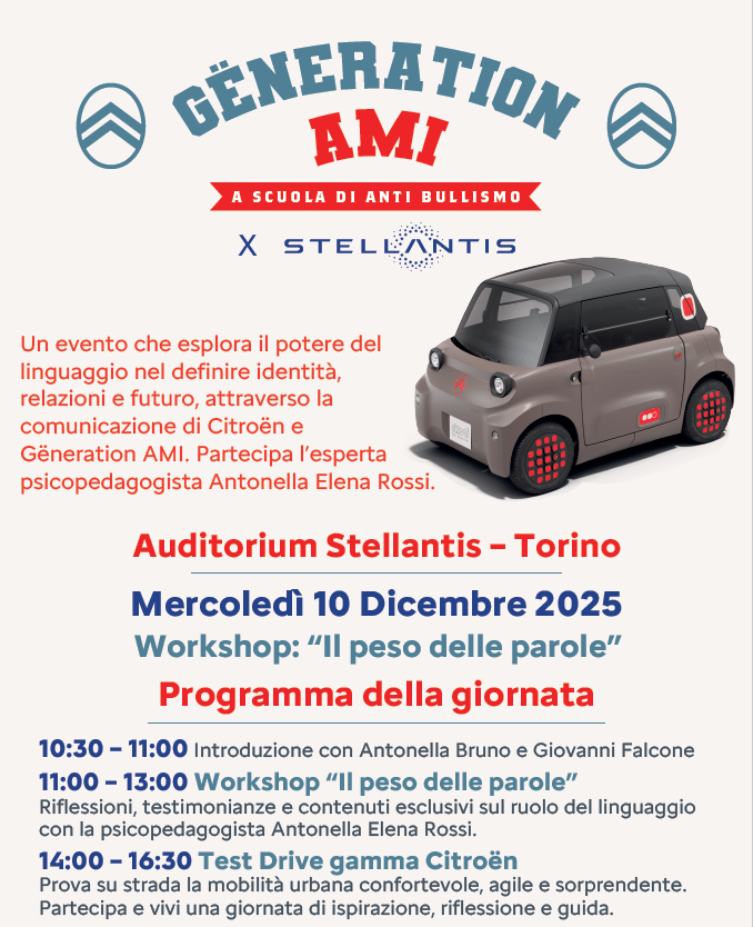 Dopo il benvenuto di Antonella Bruno, Country Manager Stellantis Italia, e l’introduzione di Giovanni Falcone, Managing Director Citroën Italia, sulla storica vicinanza della Marca alle persone, e il case history Generation Ami illustrato dal Communication Manager Davide Nava, i partecipanti potranno interagire con l’esperta, porre domande e ricevere un memorandum di consigli pratici per affrontare il bullismo e supportare i propri figli o i ragazzi a loro vicini.