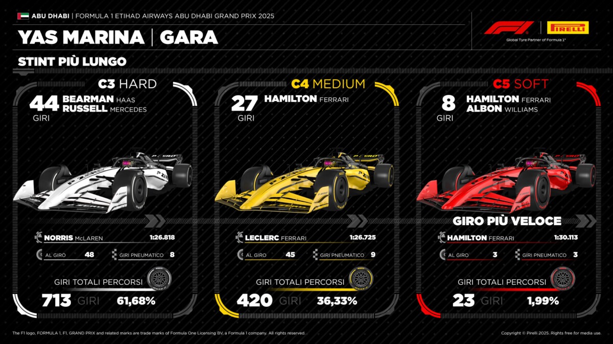 Mario Isola, direttore motorsport Pirelli: “I nostri complimenti a Lando Norris per la conquista del suo primo titolo piloti. La lotta è rimasta aperta fino all’ultima gara della stagione, una delle più combattute degli ultimi anni grazie alla grande vicinanza di prestazioni tra le diverse scuderie. Max Verstappen e Oscar Piastri non si sono certo risparmiati oggi, regalandoci un finale emozionante. Sul fronte strategico, come previsto, la maggior parte dei team ha optato per le due mescole più consistenti, puntando a una sola sosta e, in alcuni casi, prolungando lo stint con la Hard oltre i quaranta giri. Nonostante sulla gomma più dura non si sia manifestato graining, la C3 ha inevitabilmente mostrato segni di usura nelle tornate finali.