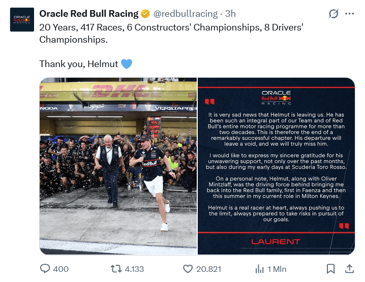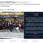 Oliver Mintzlaff, CEO Corporate Projects and Investments Red Bull: “Helmut mi ha contattato con l’intenzione di concludere il suo ruolo di consulente per il motorsport alla fine dell’anno. Mi rammarico profondamente della sua decisione, poiché è stato una figura influente per oltre due decenni e la sua partenza segna la fine di un’era straordinaria. In oltre 20 anni, Helmut ha guadagnato meriti incomparabili per il nostro team e per l’intera famiglia del motorsport Red Bull. Ha svolto un ruolo decisivo in tutte le decisioni strategiche chiave che hanno reso Red Bull Racing ciò che è oggi: un pluricampione del mondo, un motore di innovazione e una pietra miliare del motorsport internazionale.