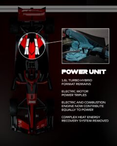 • Ibrido semplificato: MGU-H rimosso; potenza MGU-K aumentata significativamente (da 120 kW a 350 kW) per