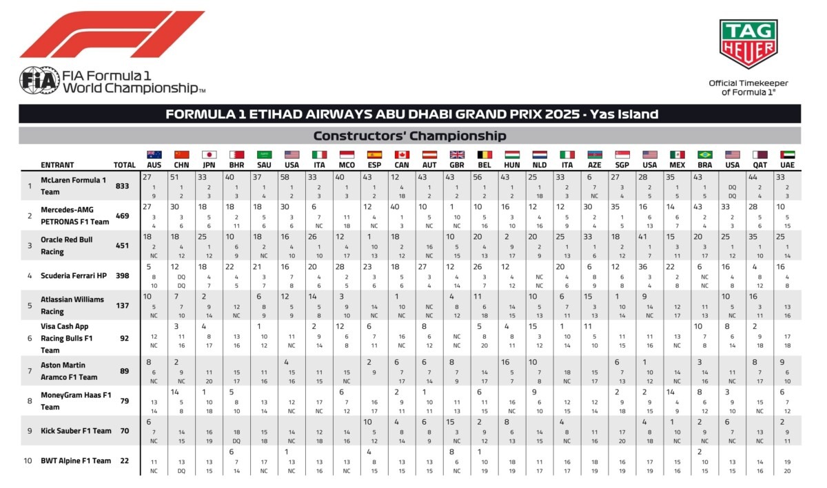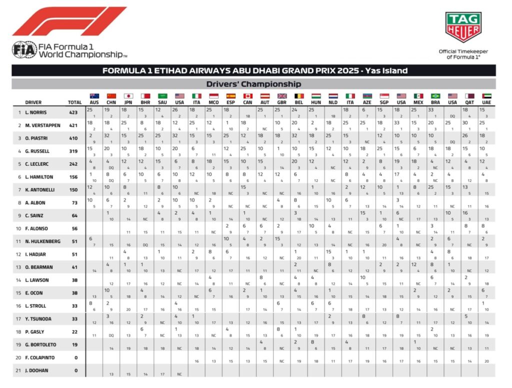 Questo risultato conferma quanto la serenità interna a un team incida sulle prestazioni. McLaren ha eseguito un weekend impeccabile, così come la Red Bull con Max Verstappen. L’olandese, pur ribadendo il valore dei suoi quattro Titoli mondiali, è stato “vittima” di una fase di tensione interna a metà stagione che ha compromesso il cammino iridato. Con l’arrivo di Laurent Mekies la squadra ha ritrovato equilibrio e ha saputo riaprire la lotta fino all’ultima gara. Piastri chiude terzo in classifica: per l’australiano sono risultati decisivi i due zero raccolti nel corso della stagione.