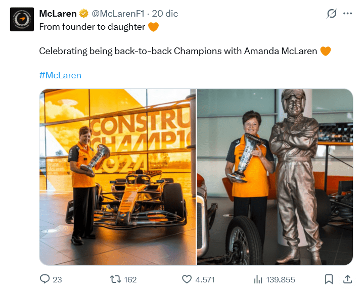 Diciamo che la colpa non era nella monoposto, ma più nella gestione interna del team che, a causa o per fortuna  delle papaya rules, qualche celato malcontento ha portato una situazione con il mondiale Piloti aperto sino alla fine. A parte l’incredibile doppia squalifica di Las Vegas, McLaren chiude questo ciclo tecnico con la vettura migliore del lotto e lo dimostra il titolo Costruttori vinto con largo anticipo. Si vede la mano di Rob Bell, troppo spesso figura dimenticata in questo passo in avanti.