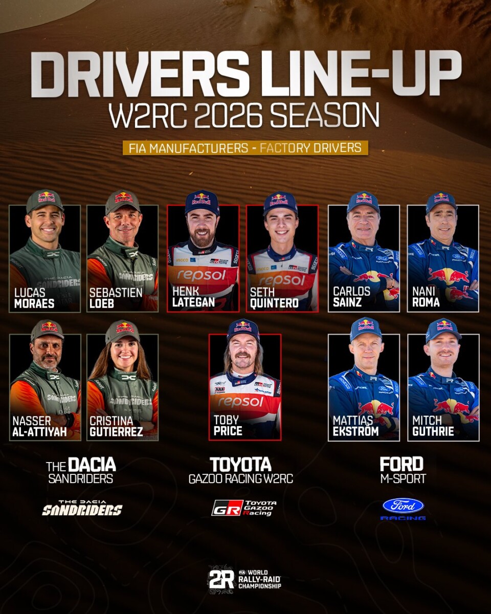 Henk Lategan e Brett Cummings che hanno già vinto una gara del Campionato Mondiale FIA Rally-Raid (W2RC), arrivando terzi nella classifica piloti e navigatori 2025, guideranno la #202 DKR GR Hilux in Arabia Saudita, cercando di fare meglio rispetto al secondo posto nell’edizione 2025. La stella nascente Seth Quintero, che ha conquistato il suo primo podio W2RC e un piazzamento tra i primi dieci al Dakar 2025, guiderà la #203 DKR GR Hilux insieme al navigatore Andrew Short. Sebbene Toby Price sia un rookie su quattro ruote, è una leggenda della Dakar dopo due vittorie nella categoria moto. Dopo aver debuttato nella classe Dakar Ultimate nel 2025 con un Toyota Hilux iscritto privatamente, guiderà la #204 DKR GR Hilux insieme ad Armand Monleón.