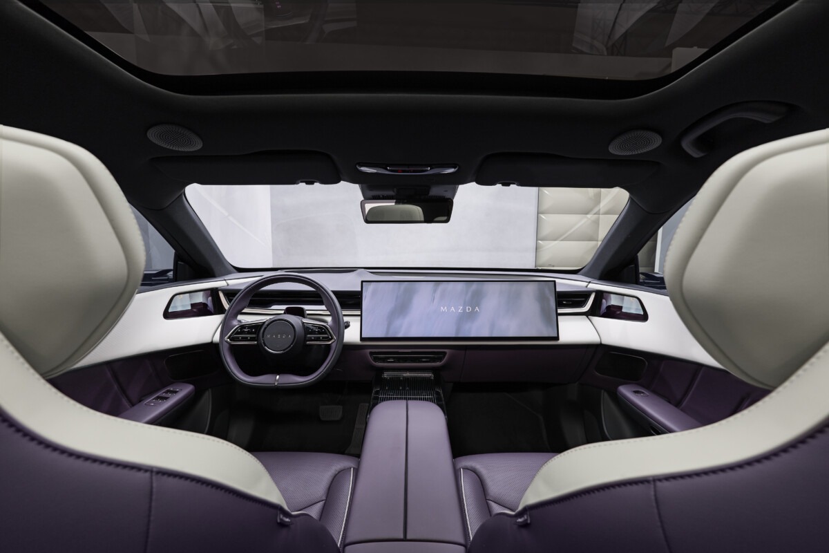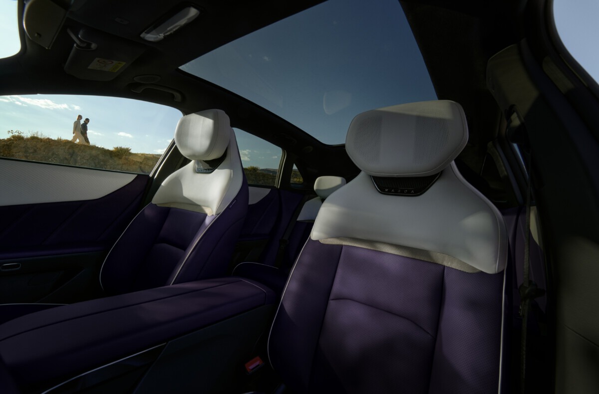 Con un passo di 2.902 mm e sbalzi ridotti, la Mazda CX-6e unisce proporzioni armoniose a capacità di carico sorprendenti: il bagagliaio offre 468 litri, che diventano 1.434 litri abbattendo la seconda fila di sedili, senza compromettere lo stile. Per la carrozzeria è disponibile una gamma di sette colori che animano le superfici scolpite e fluenti della Mazda CX-6e, tra cui spicca l’emblematica tinta Nightfall Violet, una tonalità profonda e brillante che a seconda della luce vira da un viola lucente a ombre quasi nere.