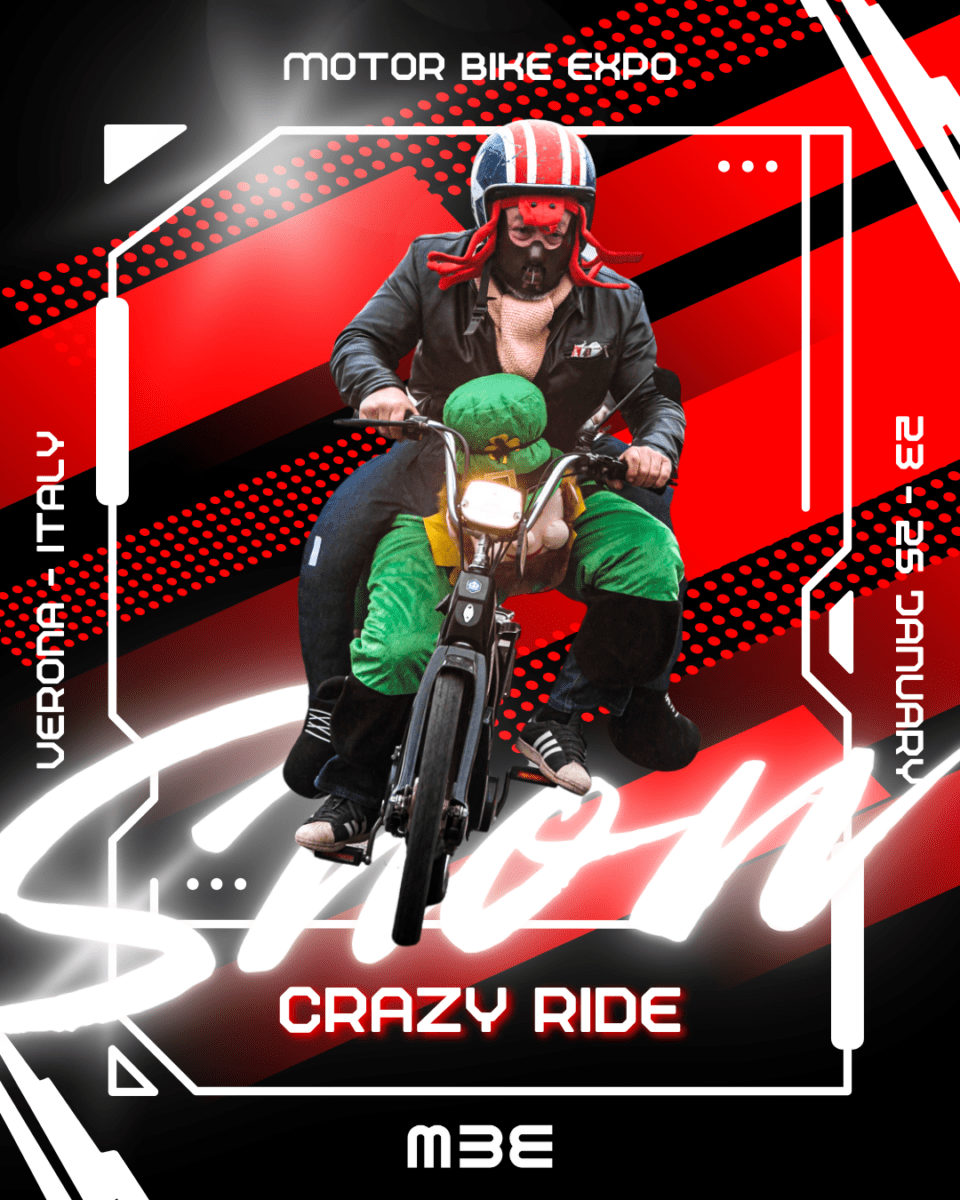 MBE sarà anche il momento di farsi travolgere dall’adrenalina a…velocità più contenuta. Per gli amanti di motorini, moped, scooter vecchi e nuovi sarà imperdibile la Crazy Ride, folcloristica parata con mezzi di piccole cilindrate, che prevede anche varie prove di abilità, come quella, appunto, di regolarità e di lentezza. In questa occasione, il vero protagonista sarà infatti il pubblico, che potrà iscriversi alla corsa attraverso l’apposito form. Per i partecipanti alla Crazy Ride il biglietto per MBE 2026 è offerto dagli organizzatori. Il progetto è supportato dal Moto Club veronese Eat Sleep Ride. Iscriviti con il tuo motorino!
