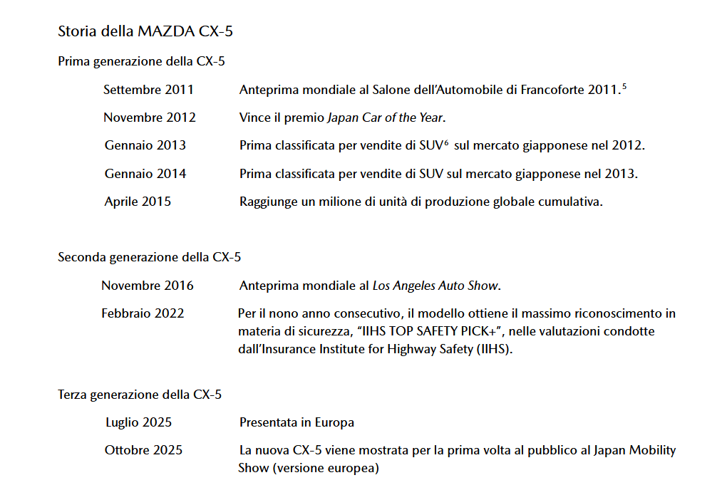 Commercializzata oggi in oltre 100 Paesi e regioni nel mondo, la Mazda CX-5 continua a essere scelta dai clienti come SUV crossover di riferimento della Casa, grazie a un design sportivo e raffinato e a un’esperienza di guida fluida e coinvolgente, che ne hanno decretato il successo nel tempo. Dall’avvio della produzione della prima generazione della CX-5 presso lo stabilimento di Ujina n. 2 nel 2011, Mazda ha progressivamente ampliato la propria presenza produttiva includendo lo stabilimento di Ujina n. 1, lo stabilimento di Hofu e impianti in Cina. L’assemblaggio locale viene inoltre effettuato in Malesia e Vietnam, consentendo alla CX-5 di affermarsi come il modello più venduto dell’attuale gamma Mazda. La nuova CX-5 è stata presentata in Europa a luglio 2025 e, dopo il debutto europeo, sarà lanciata in Nord America e in Giappone nella primavera 2026.