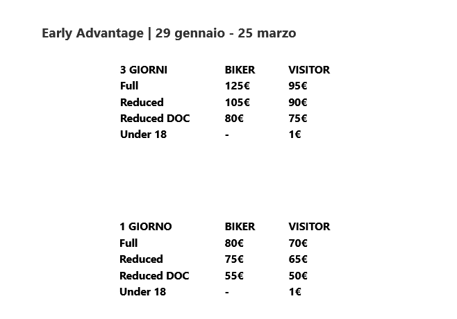 Per i minori accompagnati fino ai 18 anni l’ingresso all’evento avrà un prezzo simbolico di 1€ e sarà gratuito per tutti i partecipanti provenienti da fuori Europa (Asia, Africa, America e Oceania), per le persone diversamente abili e i loro accompagnatori. Una tariffa agevolata è riservata ai soci D.O.C, disponibile solo per i soci attivi per l’anno 2026 dei Ducati Official Club. Per informazioni è sufficiente rivolgersi al D.O.C ufficiale della propria zona. I biglietti possono essere acquistati da chiunque a un prezzo speciale anche presso le concessionarie della rete Ducati. Per ulteriori informazioni riguardo alle tariffe e alle modalità d’acquisto dei biglietti è possibile visitare la sezione dedicata del sito ufficiale Ducati. I biglietti sono disponibili esclusivamente in formato digitale e sono nominali.