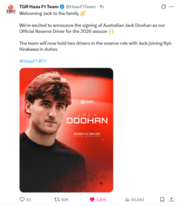 Il TGR Haas F1 Team avrà ora due piloti di riserva, con Doohan che si unirà al giapponese Ryō Hirakawa, il 31enne in forza al team dall’aprile 2025 e con alle spalle diversi test TPC e sessioni di FP1 mentre svolgeva a tempo pieno il suo ruolo di pilota per TGR nel WEC.