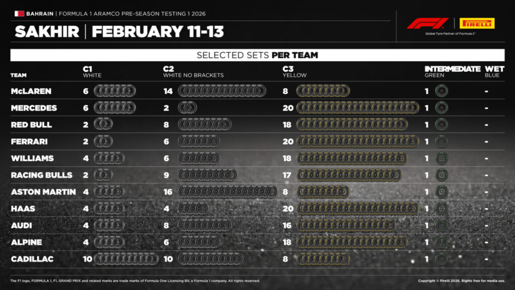 I primi tre giorni di prove si terranno da mercoledì 11 a venerdì 13 febbraio, mentre la seconda tranche è prevista da mercoledì 18 a venerdì 20 febbraio, con attività in pista dalle 10 alle 14 e dalle 15 alle 19. Nel corso dei sei giorni verrà testata l’intera gamma di mescole Pirelli, seppure con alcune distinzioni. Nei primi tre giorni, dunque durante il primo test pre‑stagionale, le squadre potranno utilizzare esclusivamente le mescole slick dalla C1 alla C3. Ogni team avrà a disposizione 28 set di gomme da asciutto e, obbligatoriamente, un set di Cinturato Intermediate.