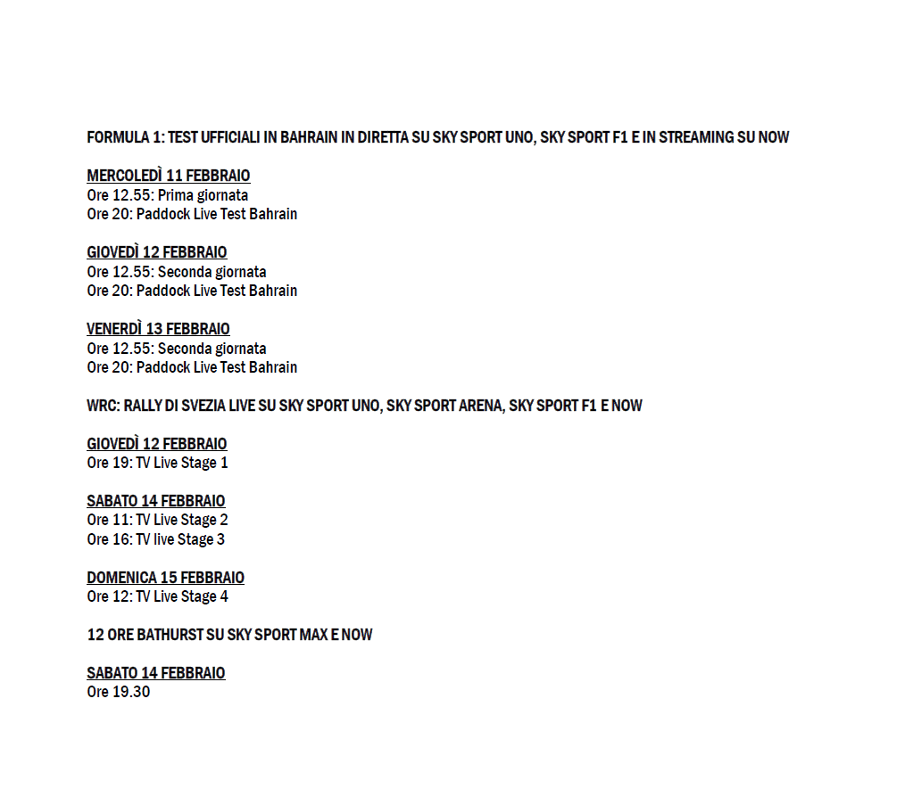 La stagione 2026 dei motori entra nel vivo su Sky e in streaming su NOW con i test F1 in Bahrain, il WRC in Svezia e la 12 Ore di Bathurst. F1 IN BAHRAIN – Da mercoledì 11 a venerdì 13 febbraio la F1 torna in pista per la tre giorni di test ufficiali sul circuito di Sakhir, in Bahrain. Grande attesa per vedere le nuove monoposto 2026 in vista del primo appuntamento dell’anno che scatterà in Australia nel weekend del 6-8 marzo. Su Sky aggiornamenti live dalle sessioni: si parte con la diretta mercoledì alle 12.55 su Sky Sport F1 (dalle 16 anche su Sky Sport Uno), in streaming sul sito SkySport.it e sul canale YouTube di Sky Sport F1. Telecronaca affidata ad Andrea Sillitti, Davide Camicioli, Matteo Bobbi e Vicky Piria. Collegamenti per ogni giornata dal circuito con Mara Sangiorgio e Ivan Capelli, inviati sul posto. Ogni sera alle 20, appuntamento con “Paddock Live Test Bahrain”, con il riassunto quotidiano e contributi speciali raccolti durante le sessioni su Sky Sport F1. Aggiornamenti continui sul canale all news Sky Sport 24, su SkySport.it e sui canali social di Sky Sport.